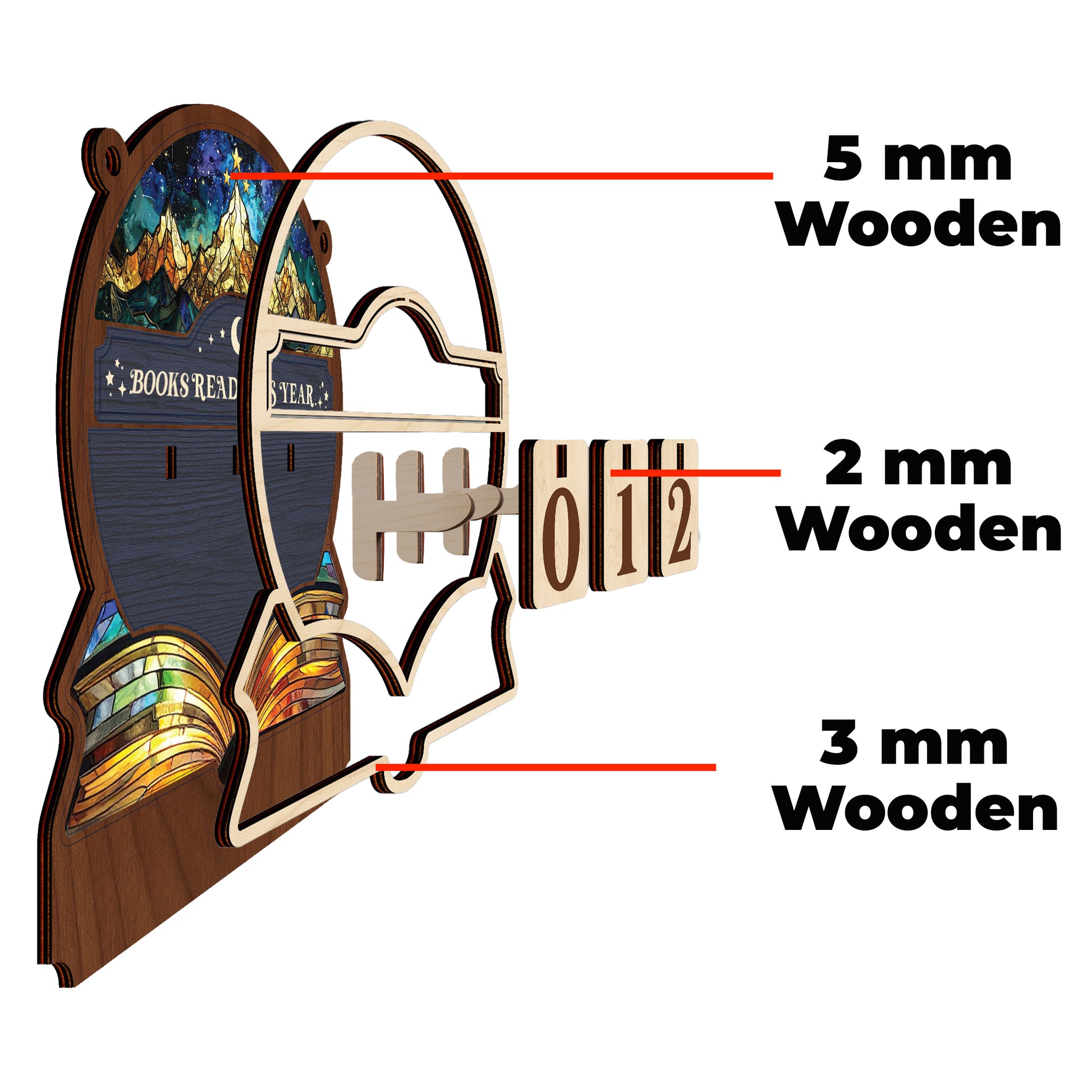 Capture the adventure. Vibrant stained glass style design featuring golden mountains and stars. Add your library name. A colorful masterpiece to track your reading goals.