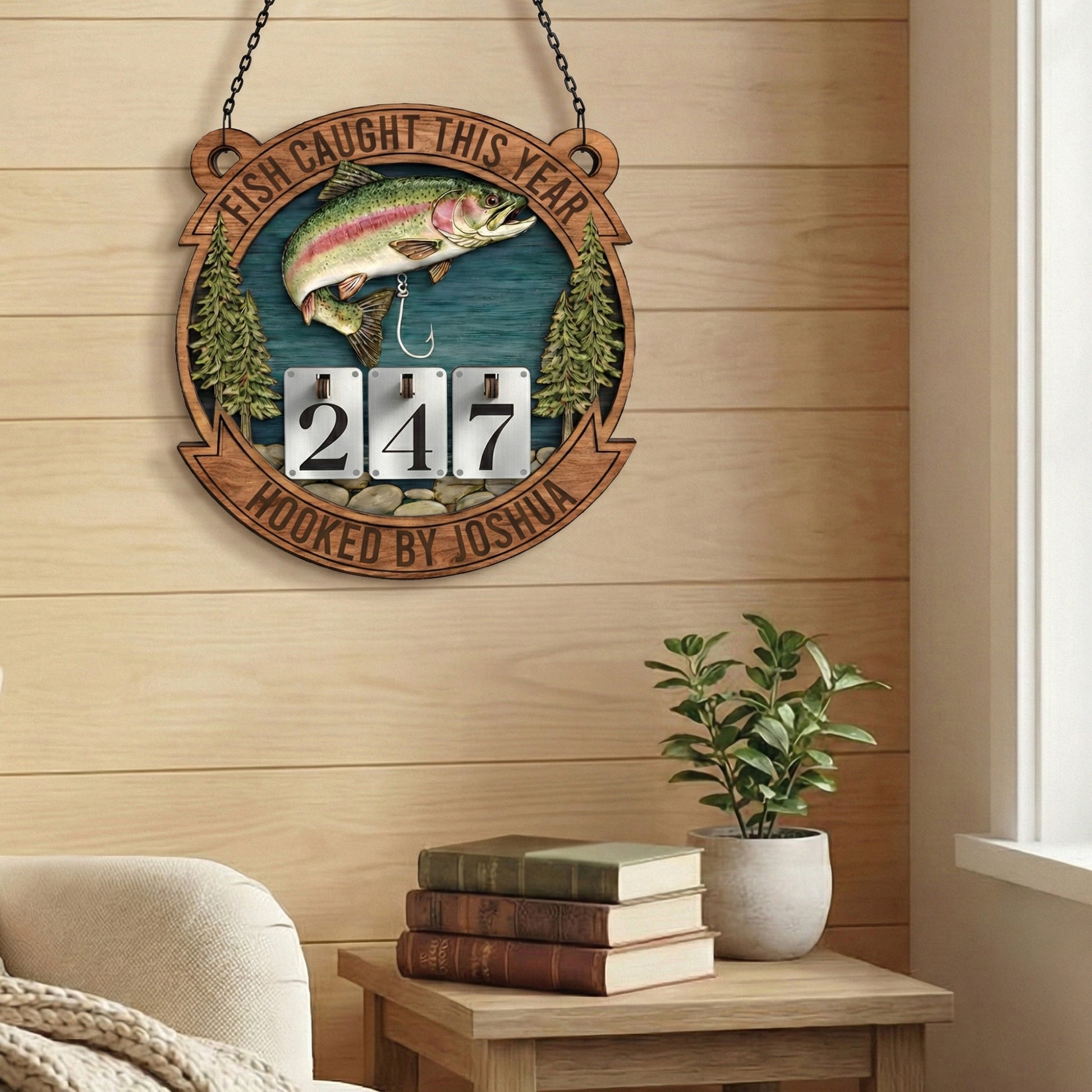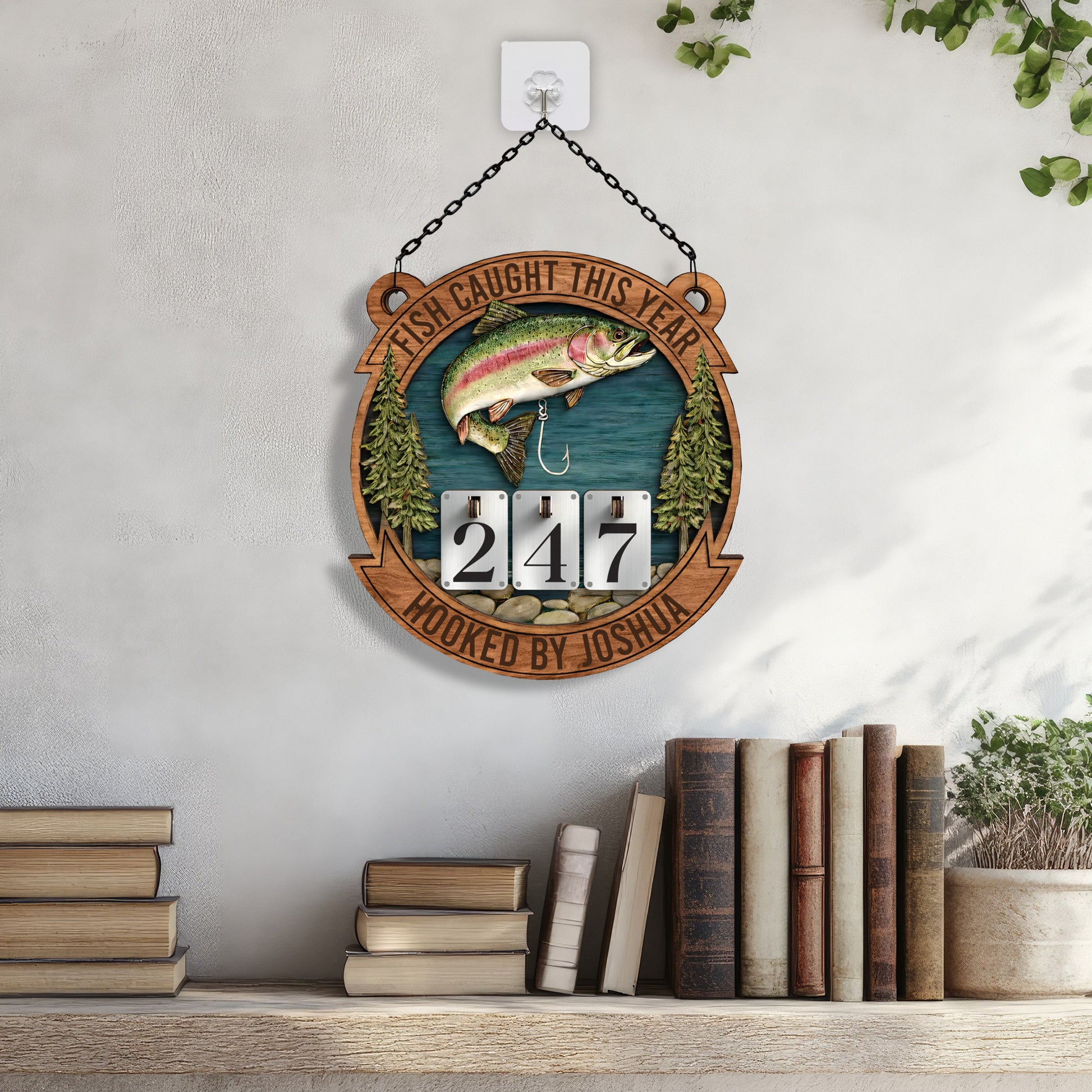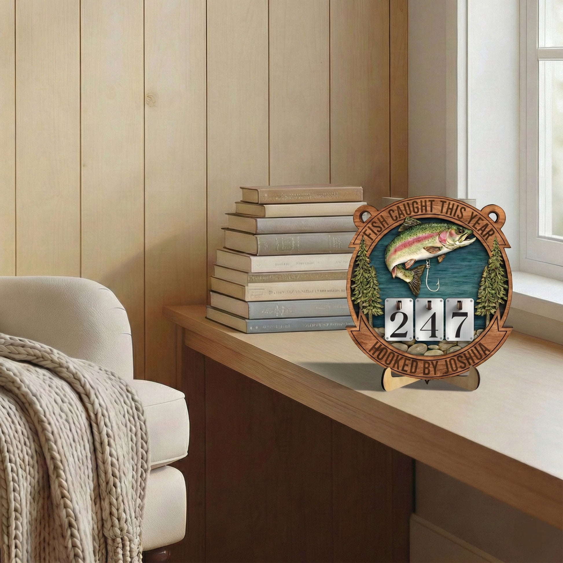 Keep score of your yearly catches in style with our personalized fishing goal sign. This handcrafted piece features intricate 3D forest graphics, a custom nameplate, and a three-digit flip counter for a truly one-of-a-kind trophy. High-quality craftsmanship for your cabin.