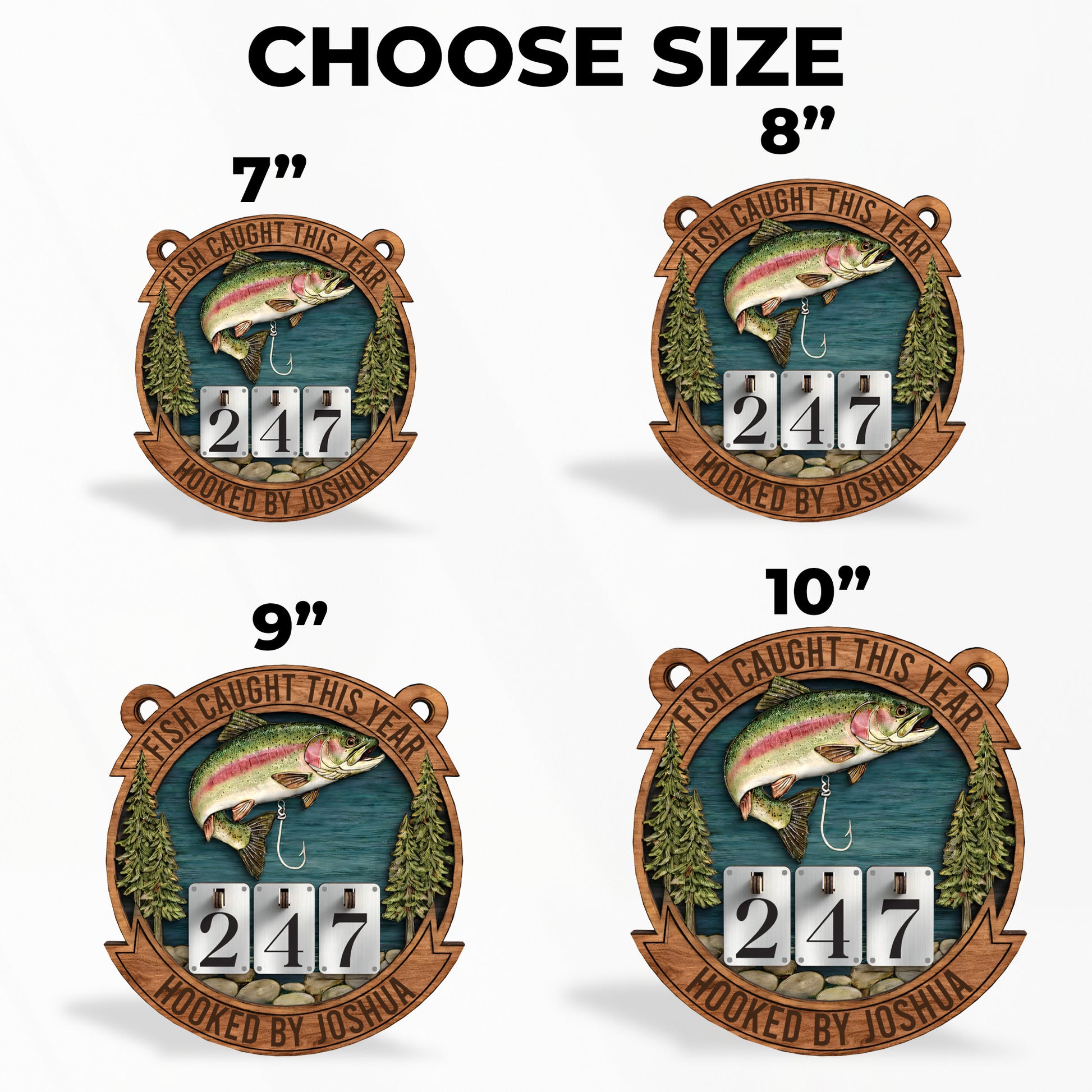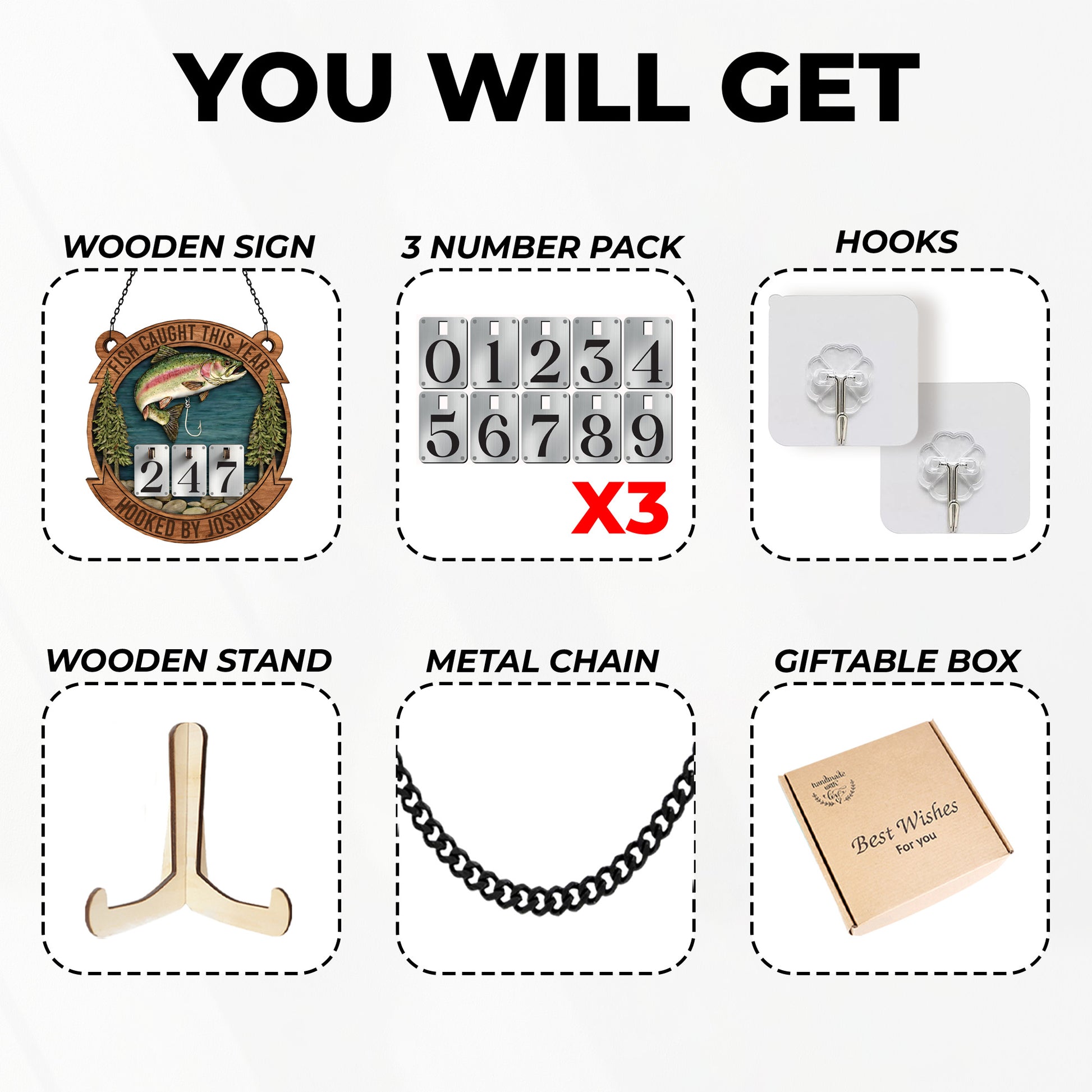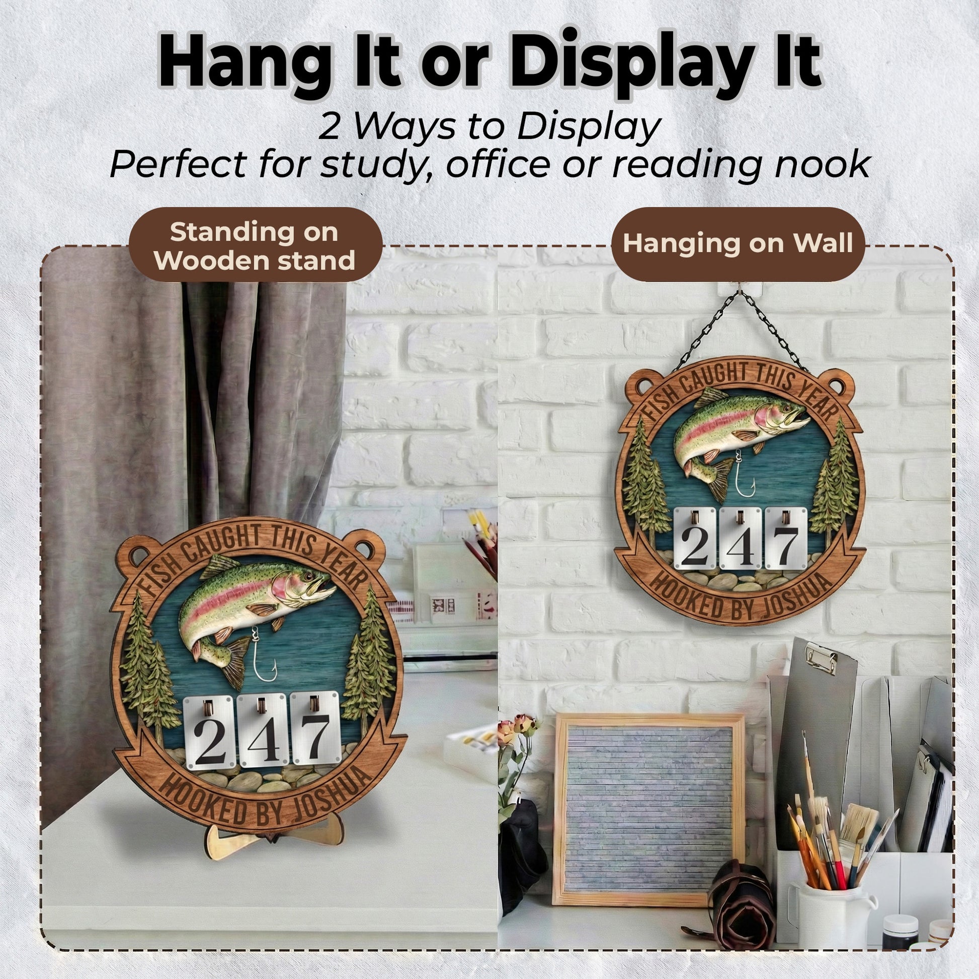 Keep score of your yearly catches in style with our personalized fishing goal sign. This handcrafted piece features intricate 3D forest graphics, a custom nameplate, and a three-digit flip counter for a truly one-of-a-kind trophy. High-quality craftsmanship for your cabin.