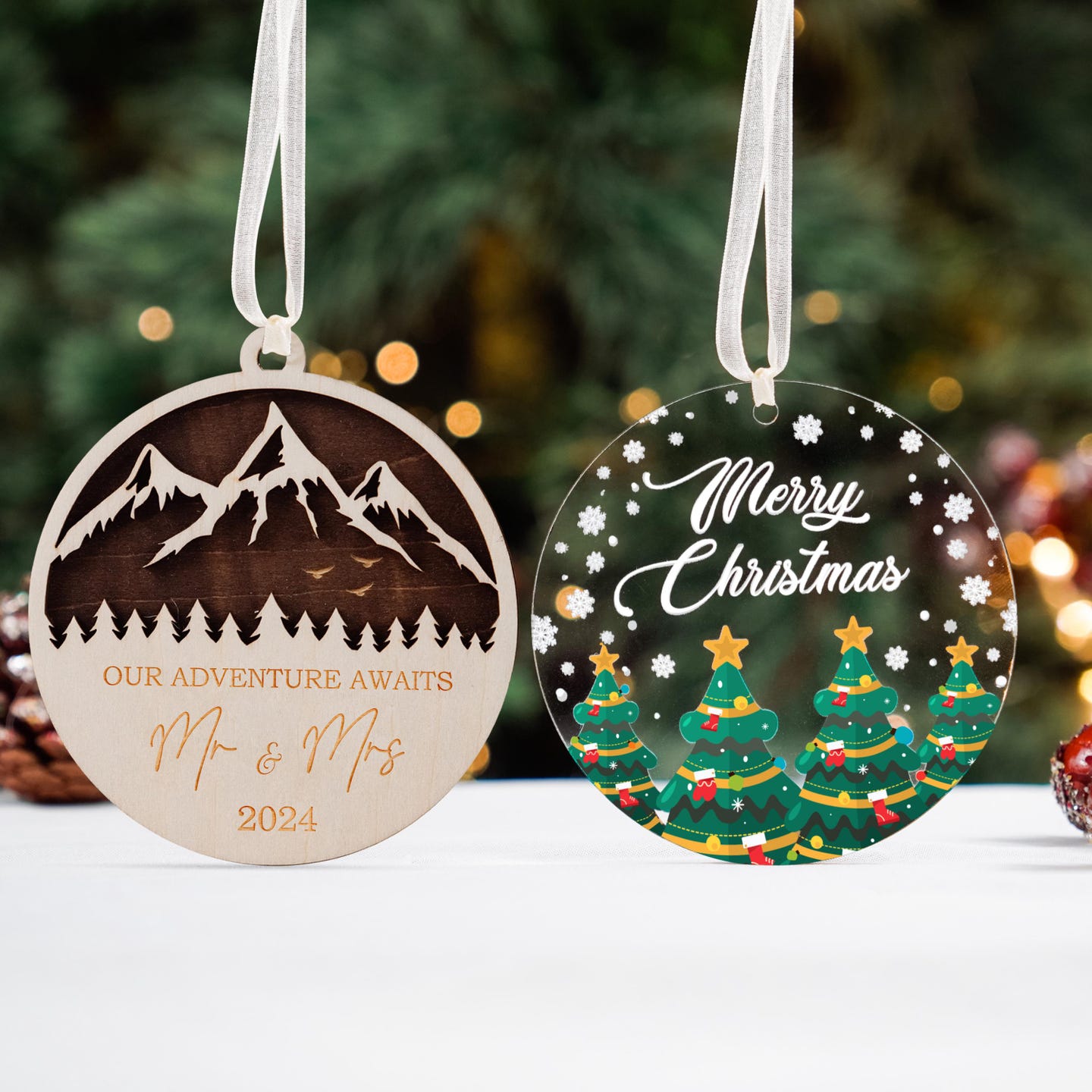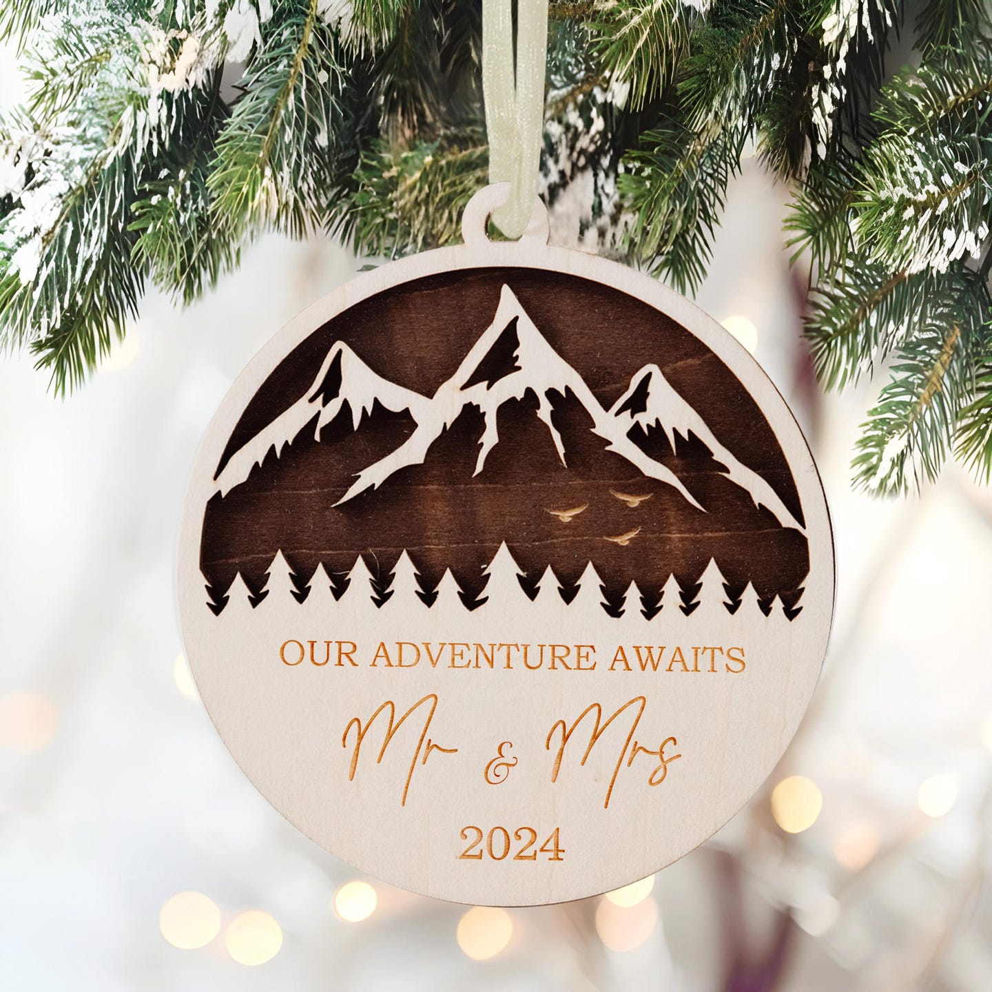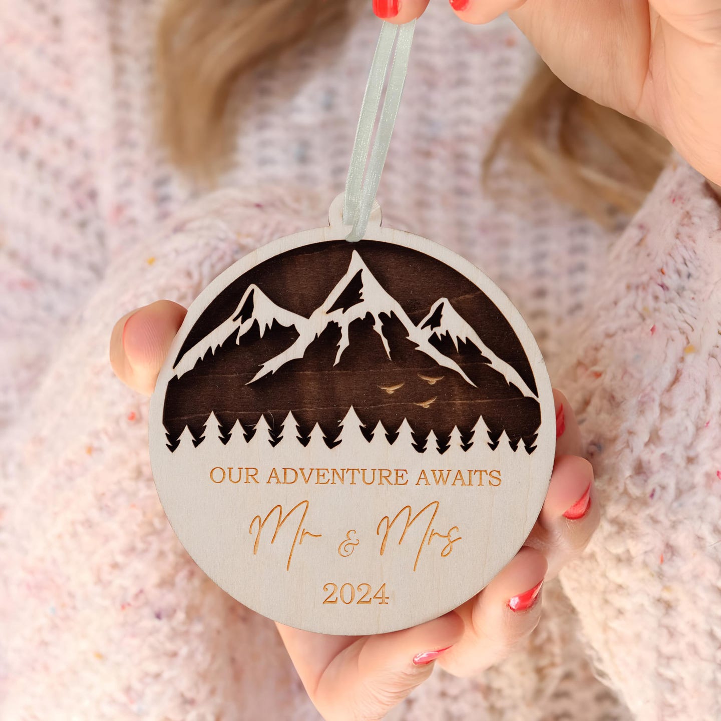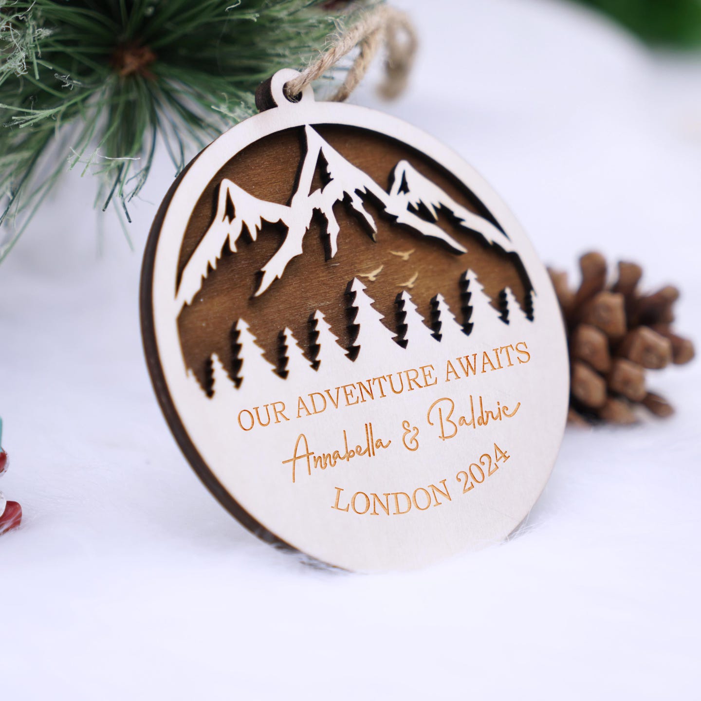 Handmade Mountains Landscape Wooden Ornament Our Adventure Awaits Personalized Names Wooden Decorations Couple Ornament Holiday Decor