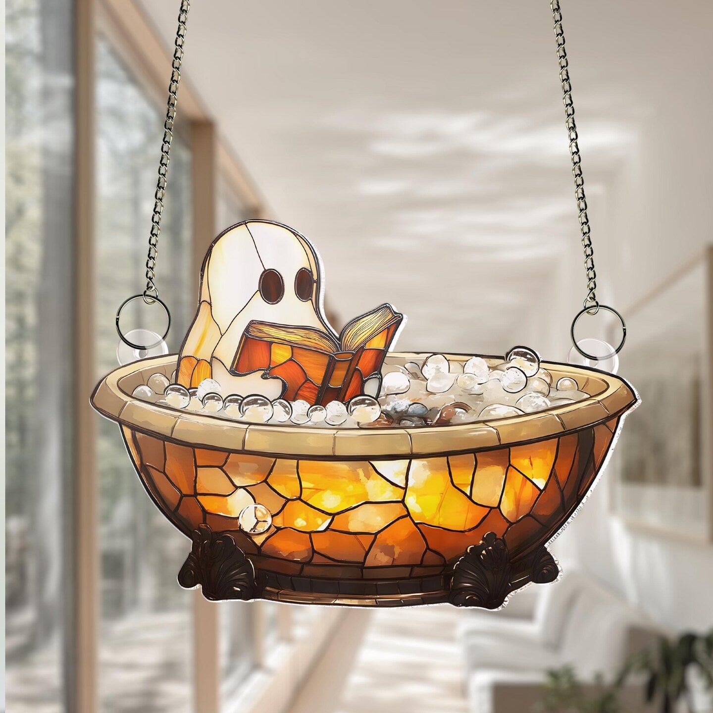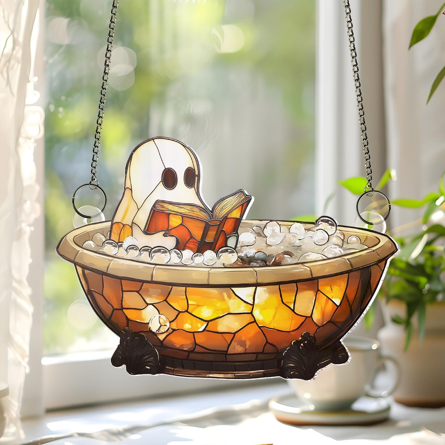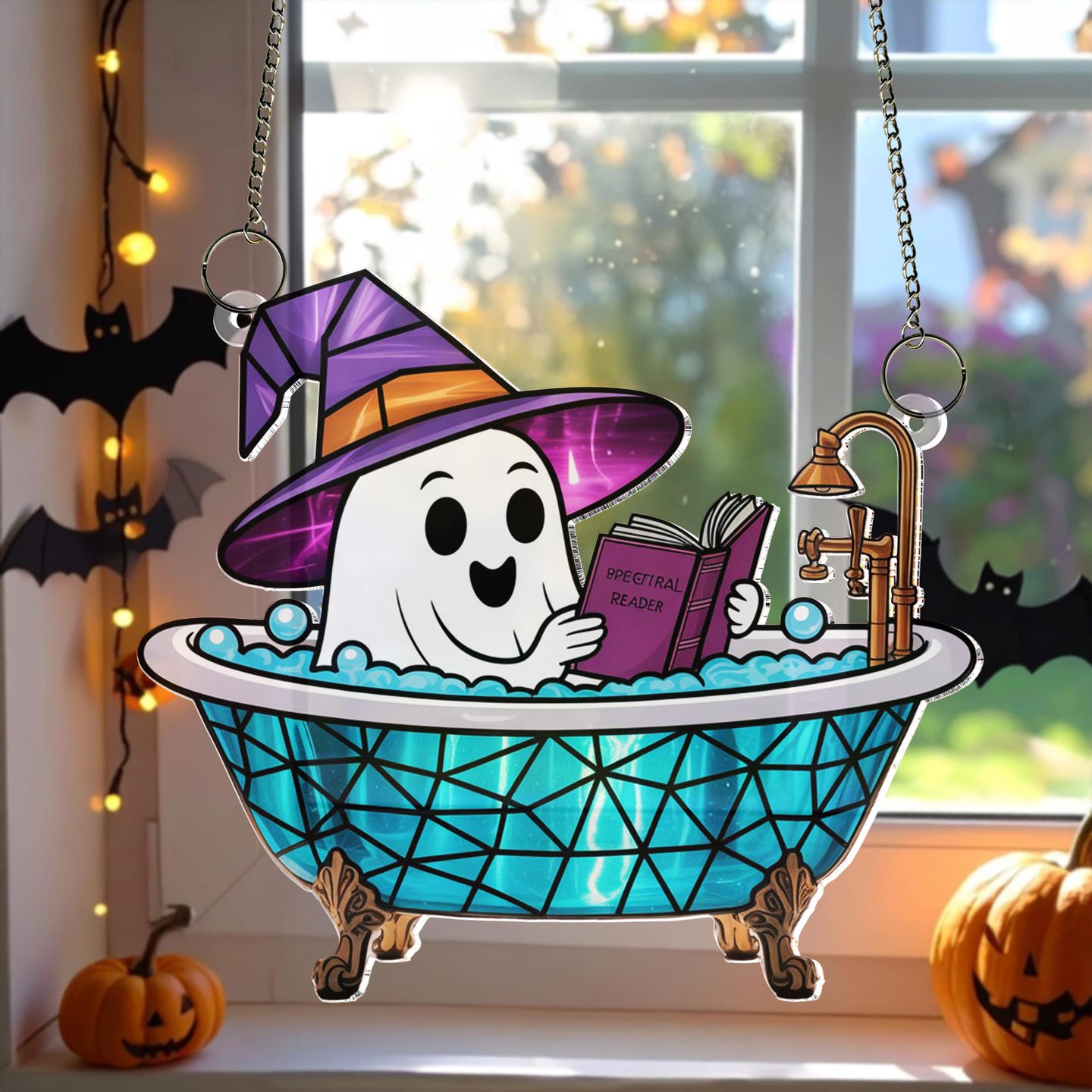 Cute Ghost Reading Book Bathroom Suncatcher,Window Hanging,Halloween Spooky,Boo Book Lover Gift,Ghost In Bathtub,Home Decor,Halloween Gift