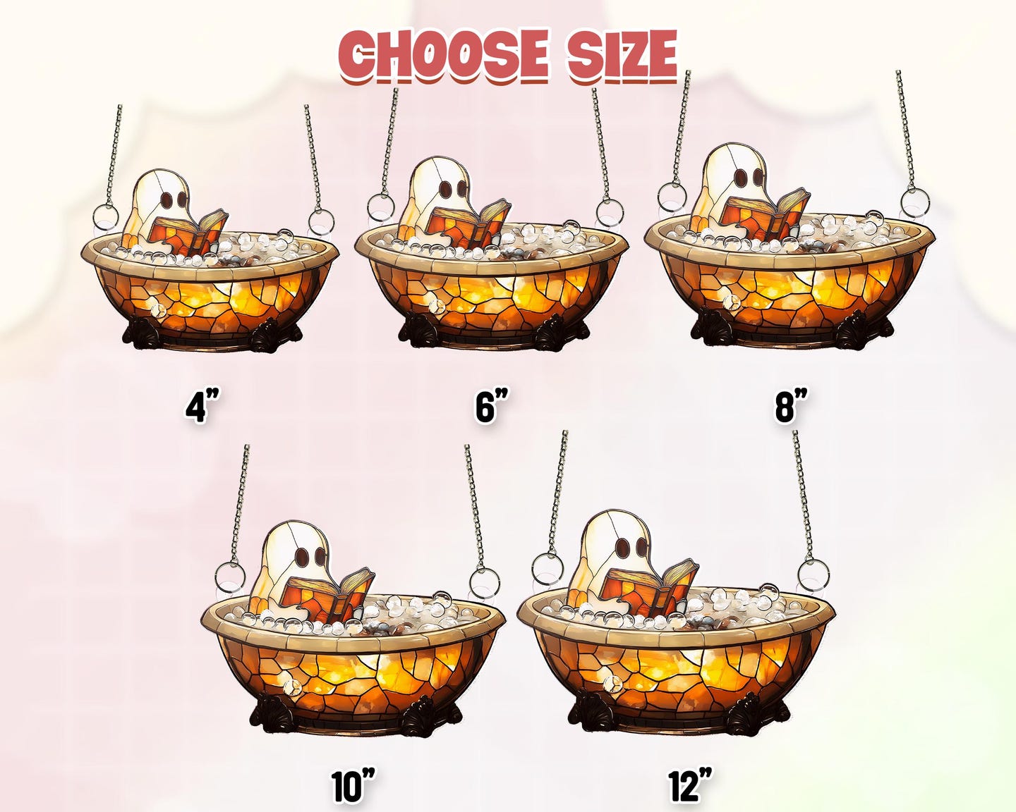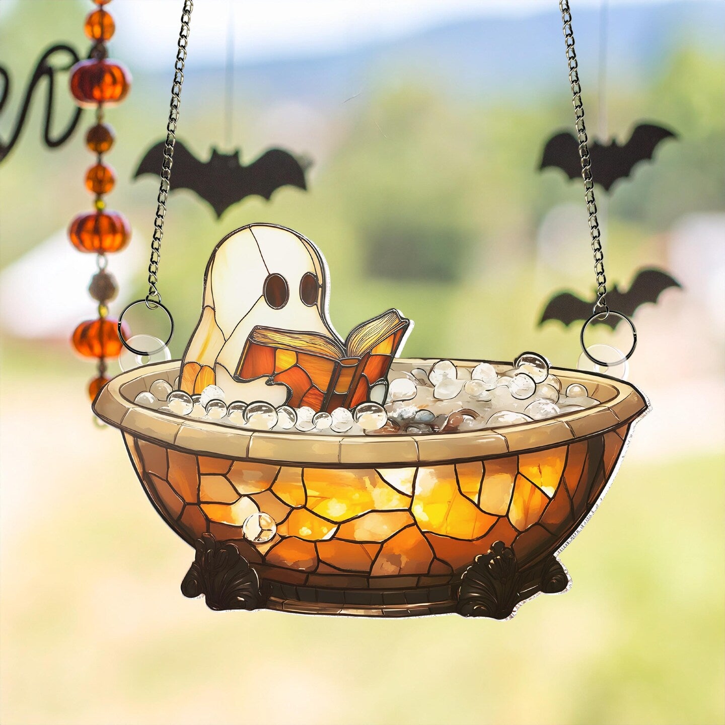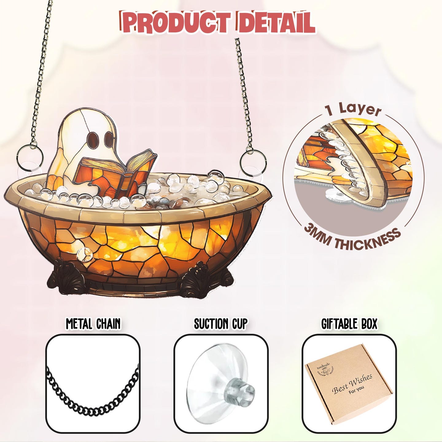 Cute Ghost Reading Book Bathroom Suncatcher,Window Hanging,Halloween Spooky,Boo Book Lover Gift,Ghost In Bathtub,Home Decor,Halloween Gift