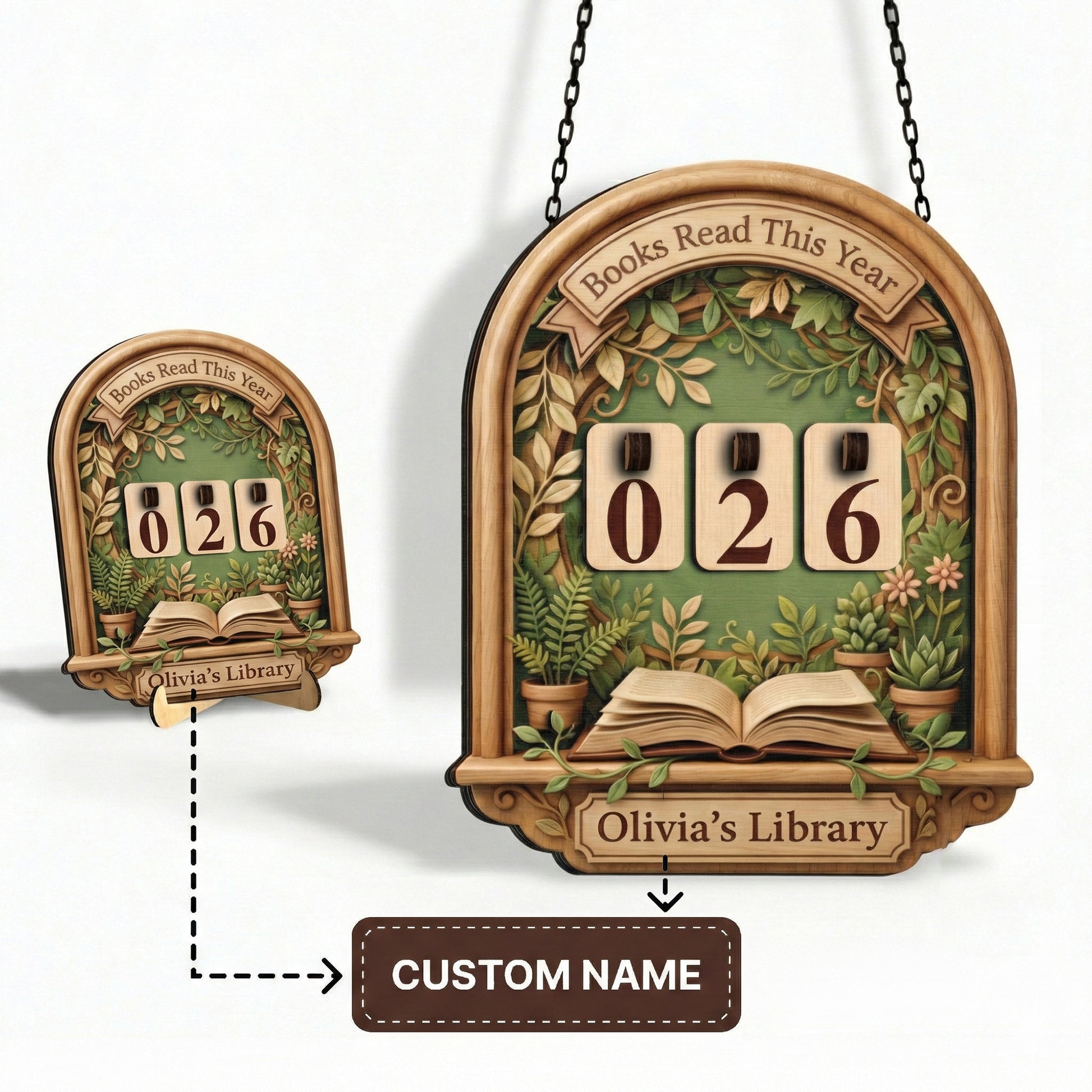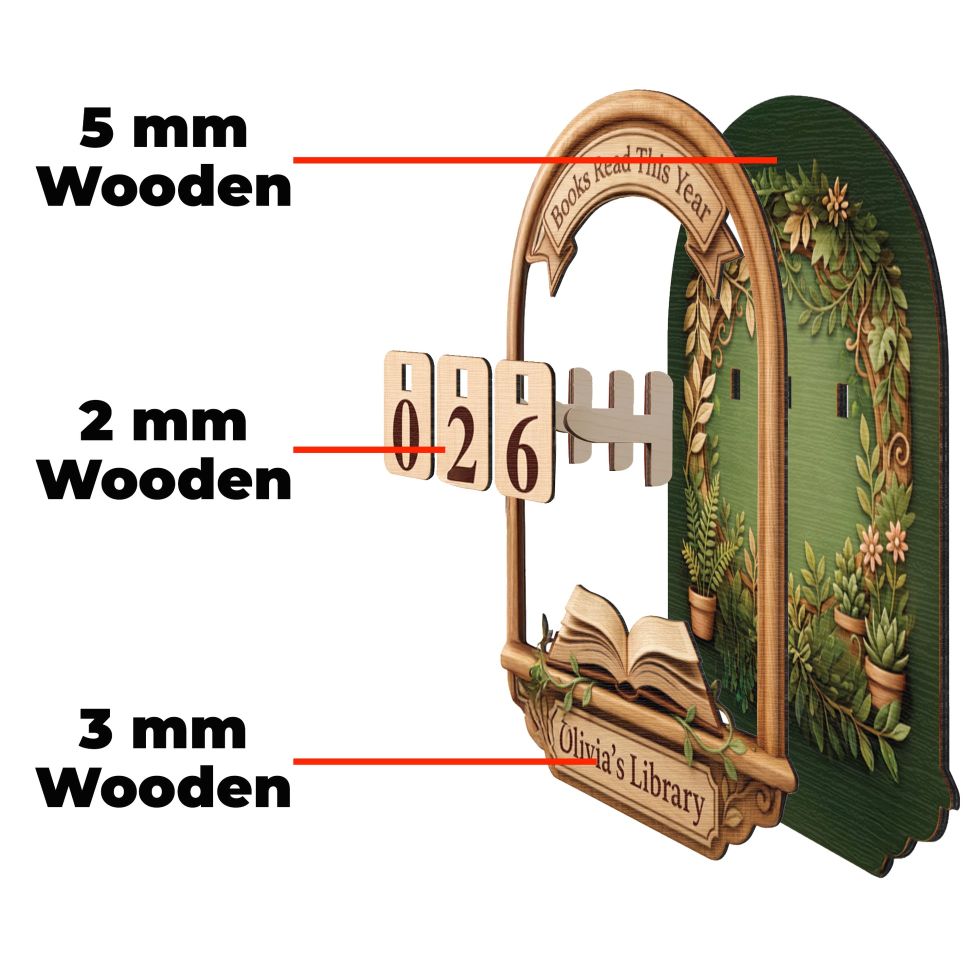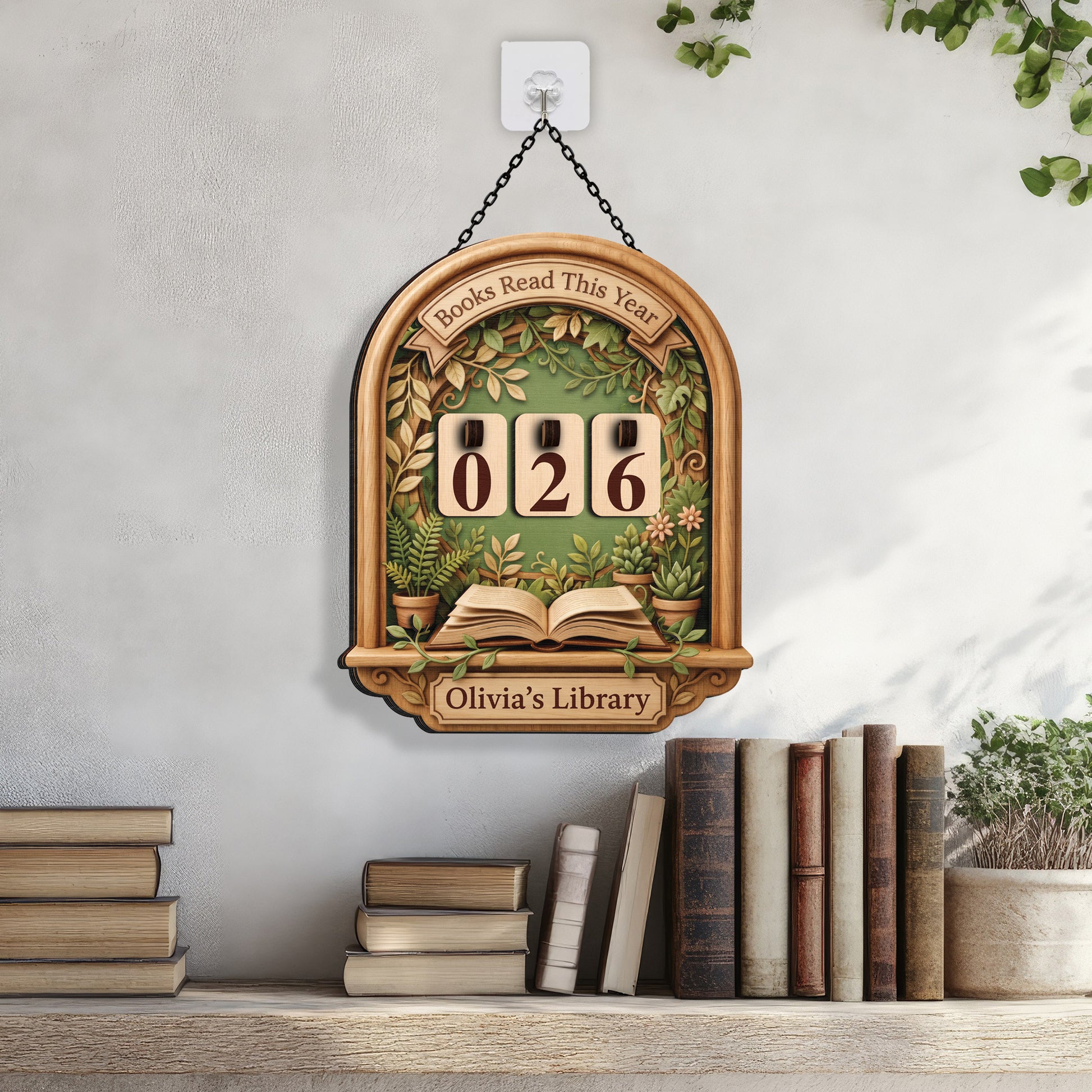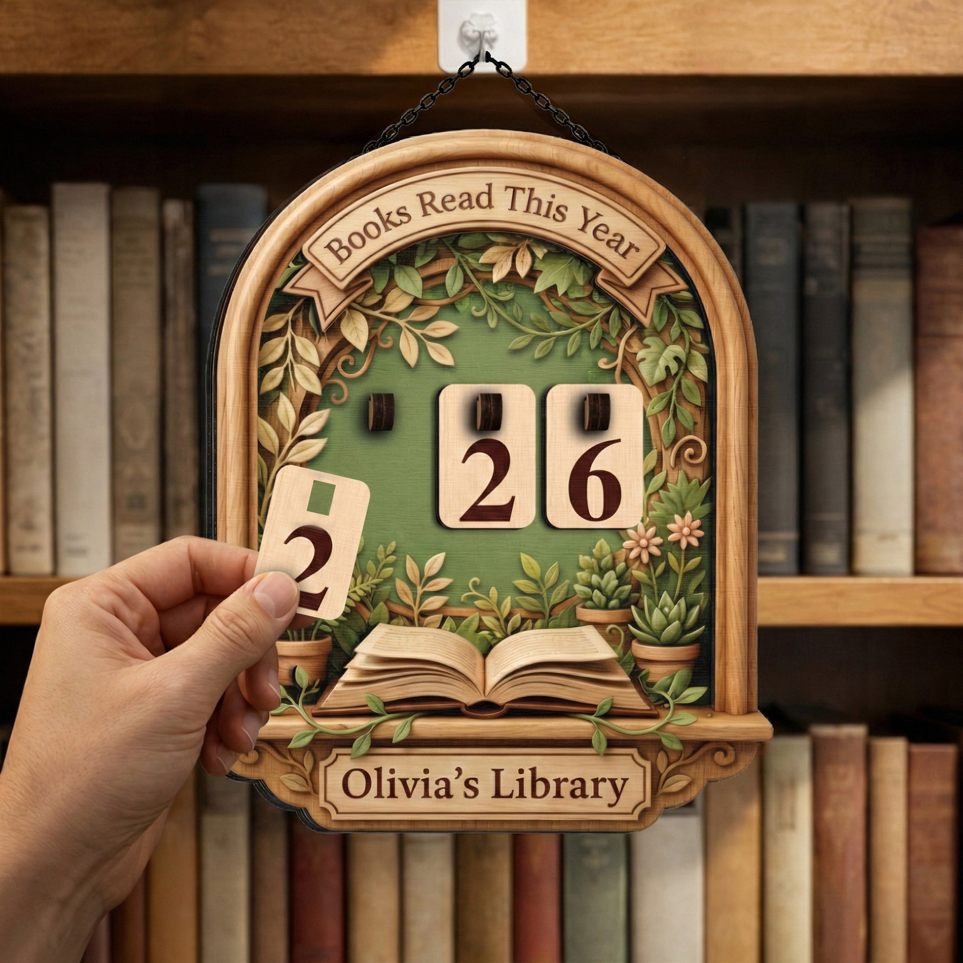 A custom wooden tracker featuring a lush botanical garden design with potted plants. Includes a 3D open book detail and changeable number tiles.