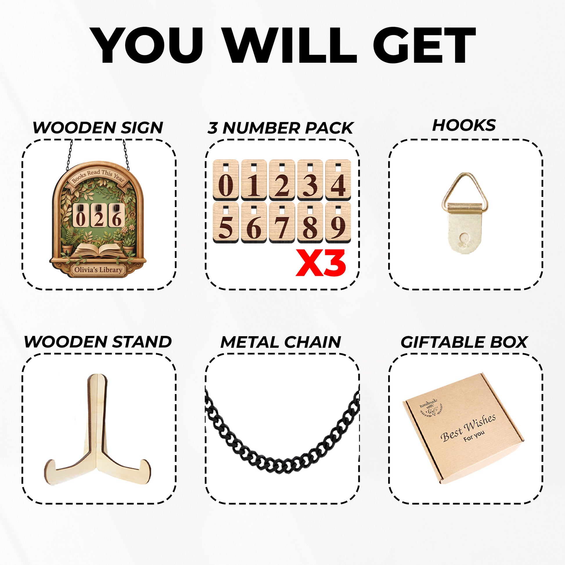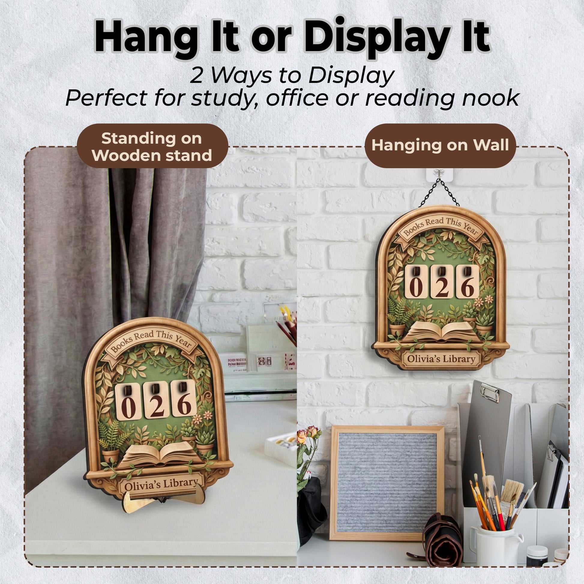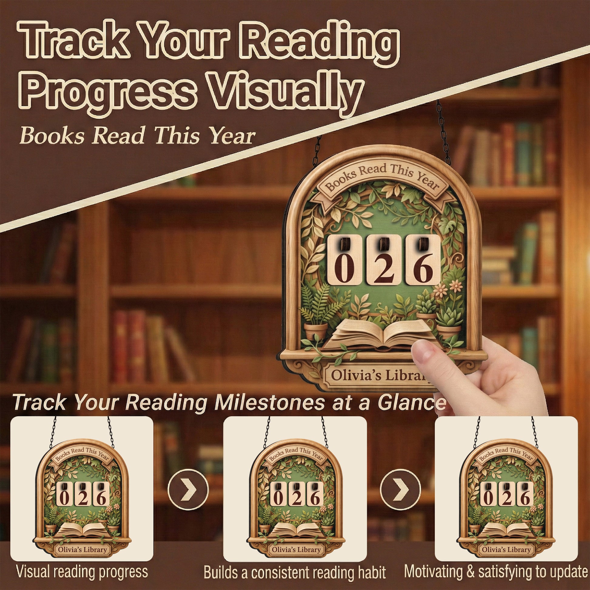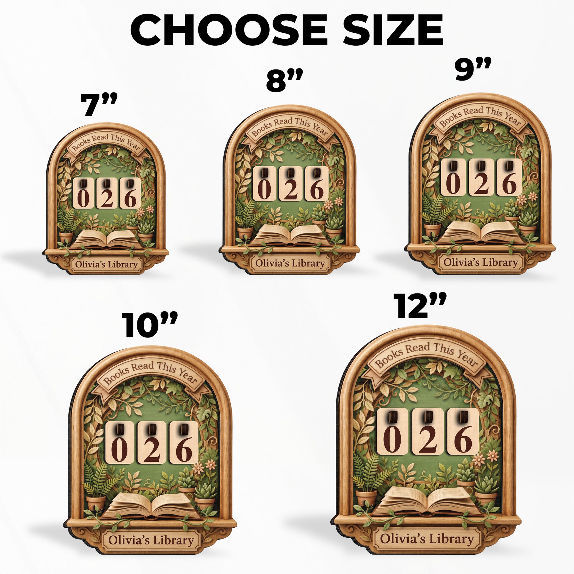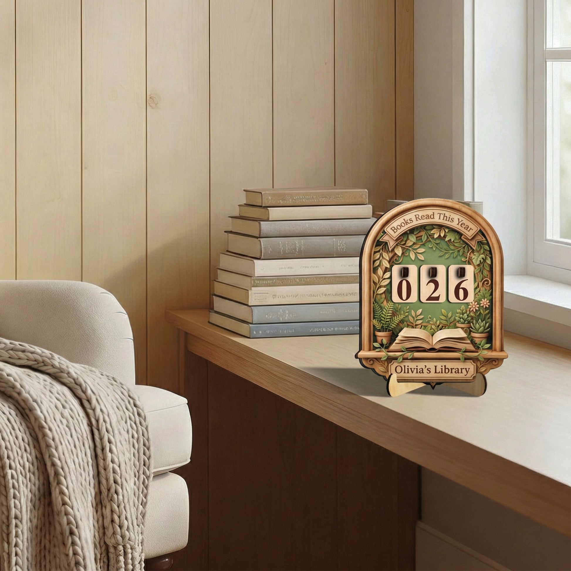 A custom wooden tracker featuring a lush botanical garden design with potted plants. Includes a 3D open book detail and changeable number tiles.