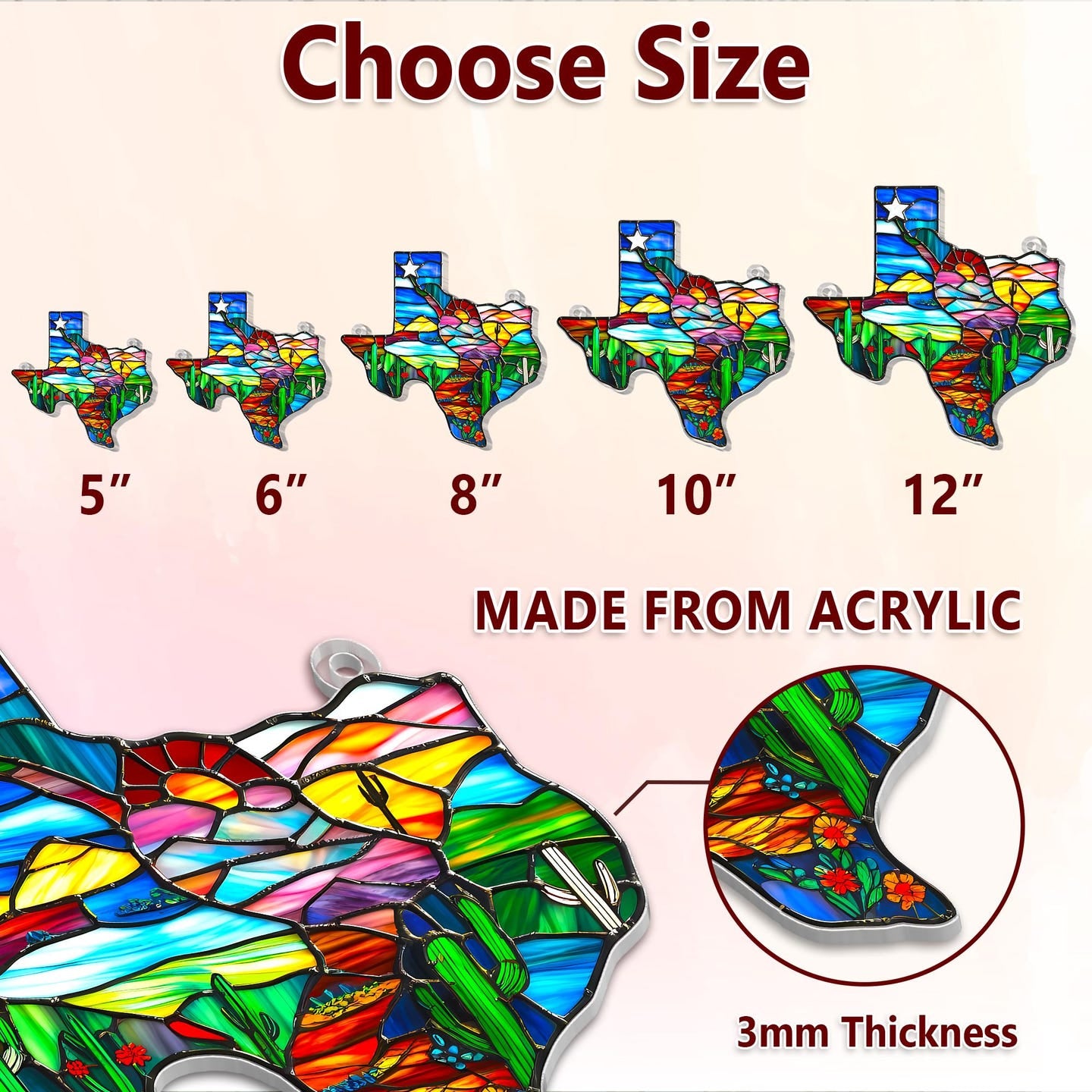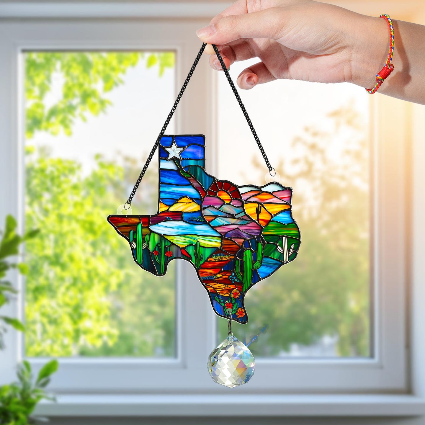 Bring the spirit of Texas into your home with this beautifully crafted stained glass-style sun catcher, shaped like the Lone Star State itself. With a rich mosaic of vivid colors, iconic desert landscapes, blooming wildflowers, and a radiant sunset, this piece captures the essence of Texas charm and natural beauty in every detail.