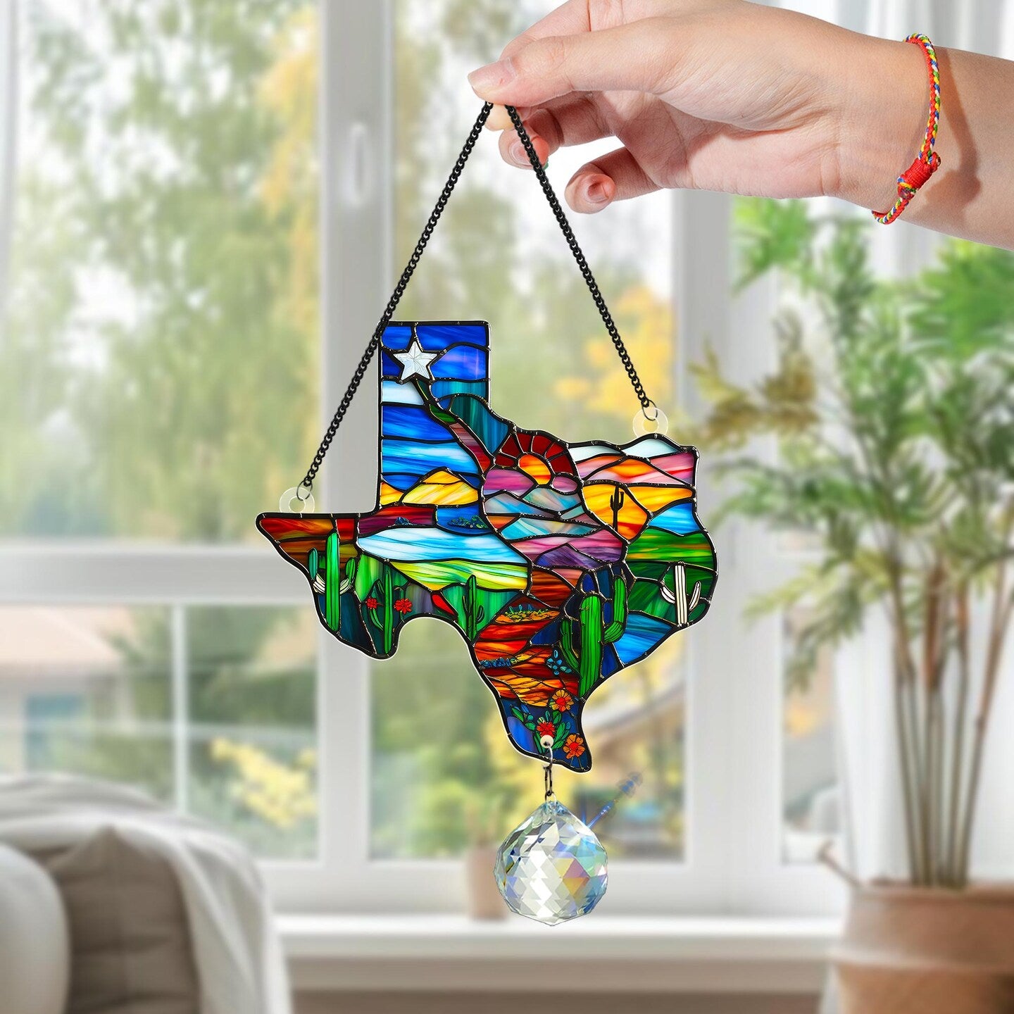 Handcrafted from premium acrylic, this piece offers vibrant colors and intricate design that captures the essence of each piece. Easy to hang & display comes with a sturdy hanging chain, making it simple to showcase on windows, porches, balconies, or interior walls. Wherever it’s placed, it’s sure to bring a burst of color and personality.