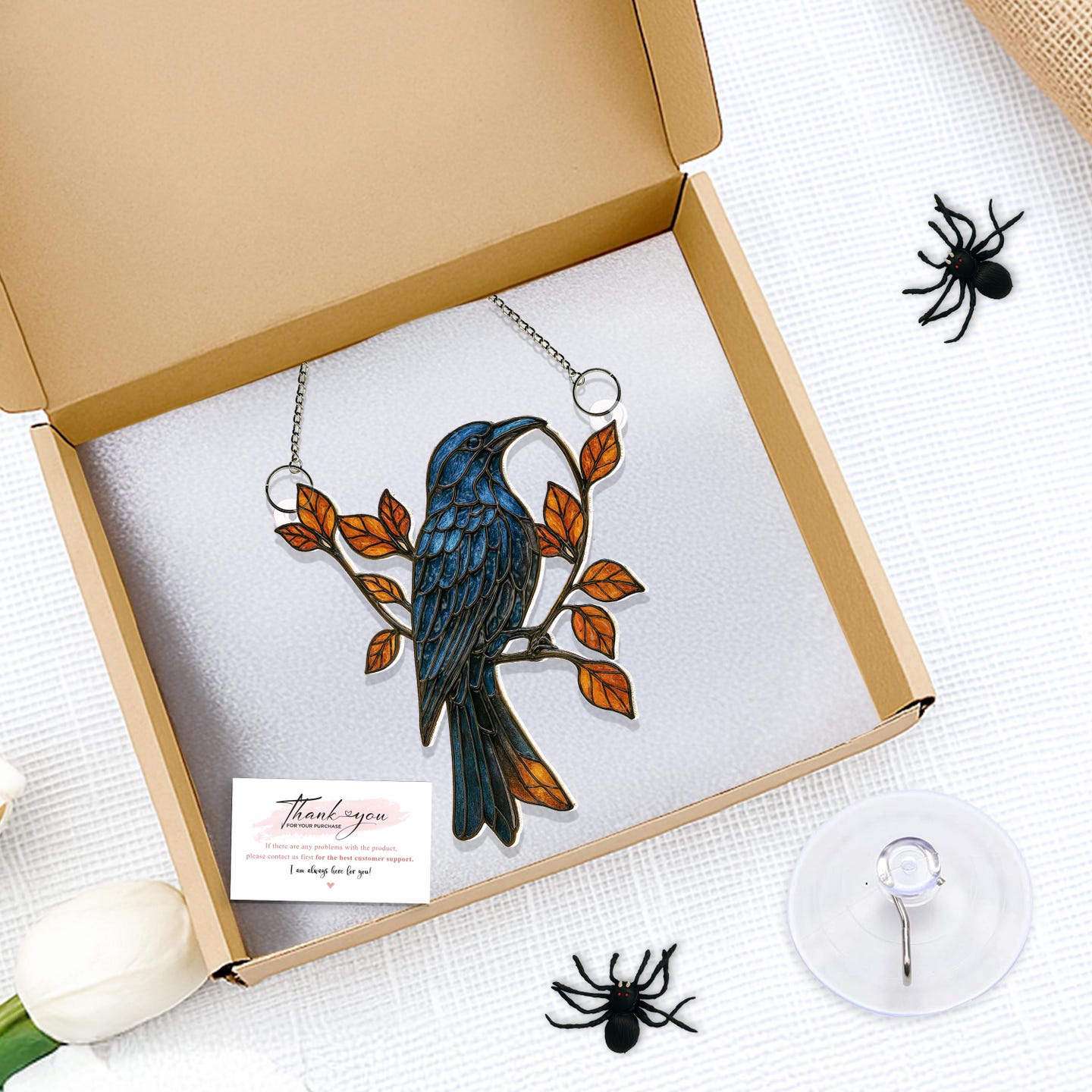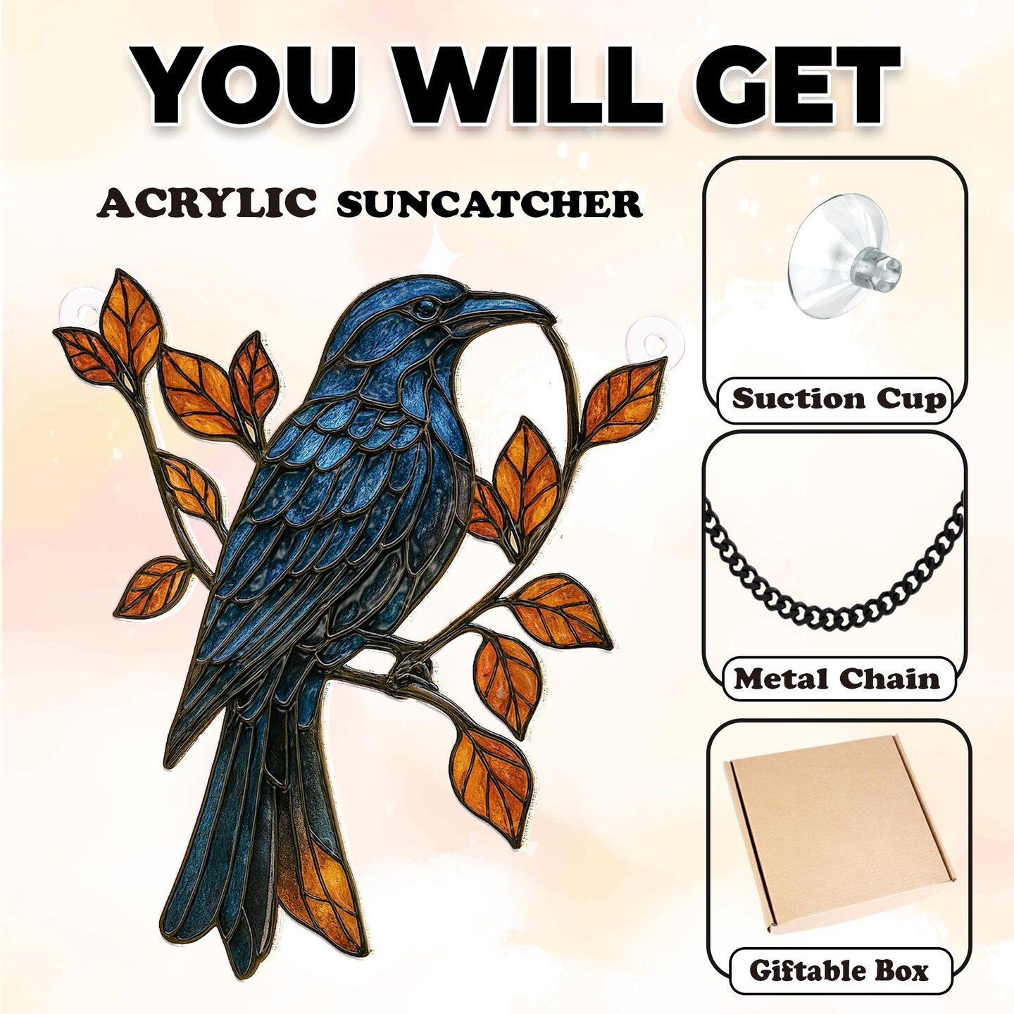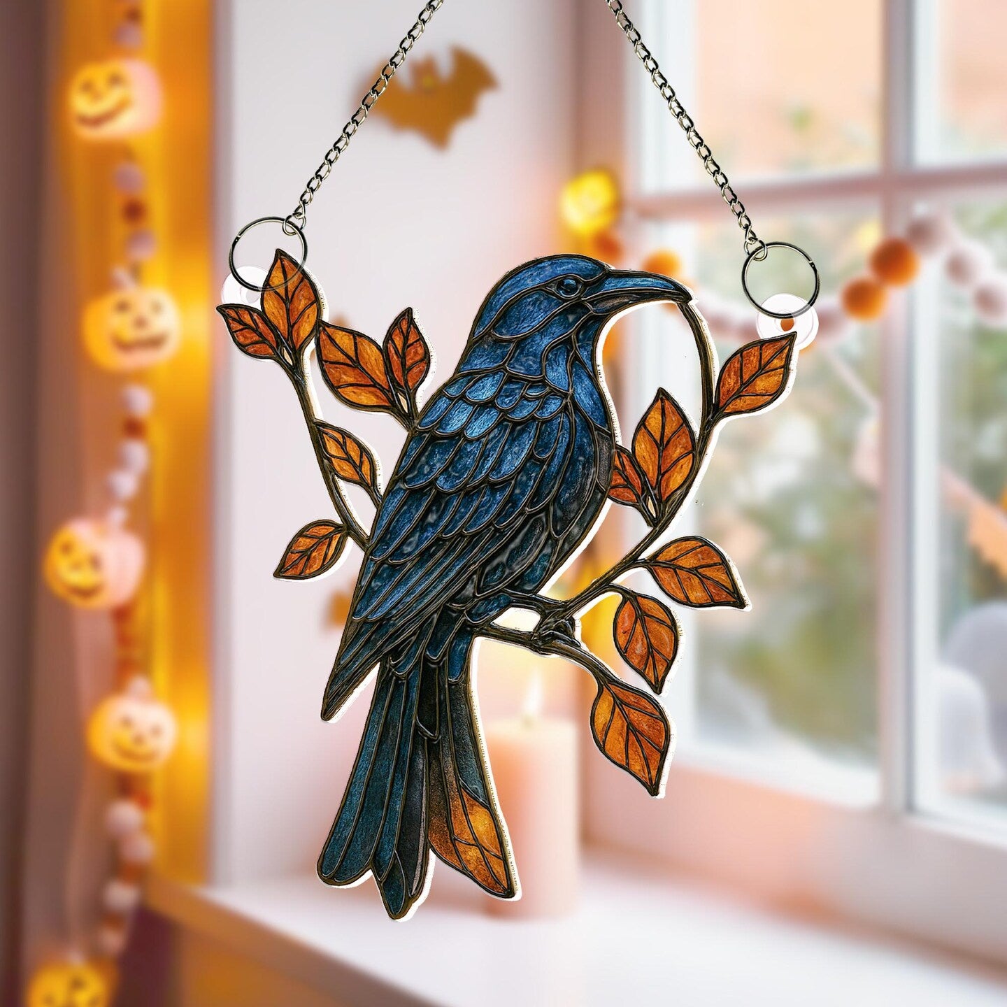 - This raven suncatcher is carefully crafted from acrylic — a lightweight yet durable material that beautifully mimics the look of stained glass. The acrylic allows light to pass through softly, creating a glowing effect that brings the raven and autumn leaves to life when hung near a window or under natural sunlight. Unlike traditional stained glass, acrylic is shatter-resistant and safe to hang in any space, including areas with kids or pets. It offers the elegance of glass with enhanced durability — perfect for everyday display or seasonal decor.