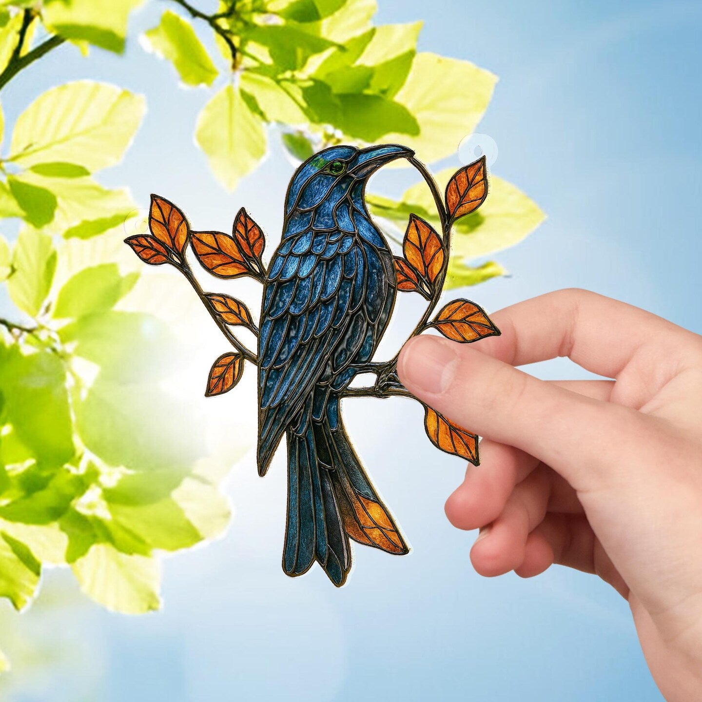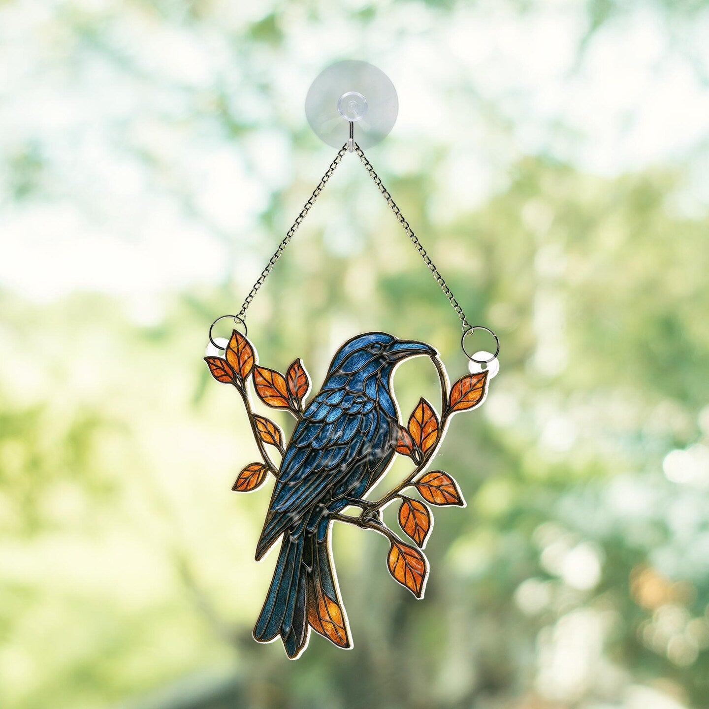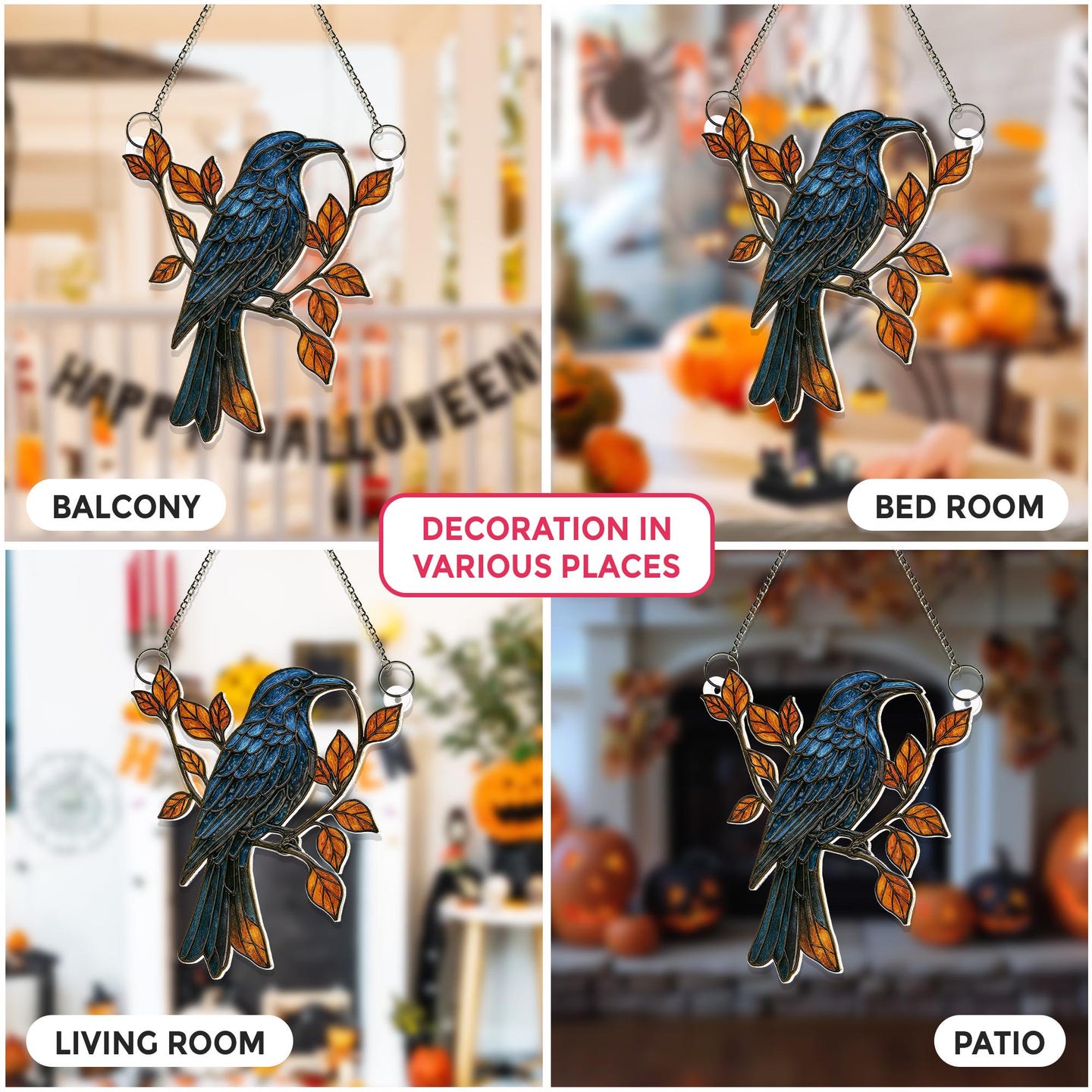 - This raven suncatcher is carefully crafted from acrylic — a lightweight yet durable material that beautifully mimics the look of stained glass. The acrylic allows light to pass through softly, creating a glowing effect that brings the raven and autumn leaves to life when hung near a window or under natural sunlight. Unlike traditional stained glass, acrylic is shatter-resistant and safe to hang in any space, including areas with kids or pets. It offers the elegance of glass with enhanced durability — perfect for everyday display or seasonal decor.
