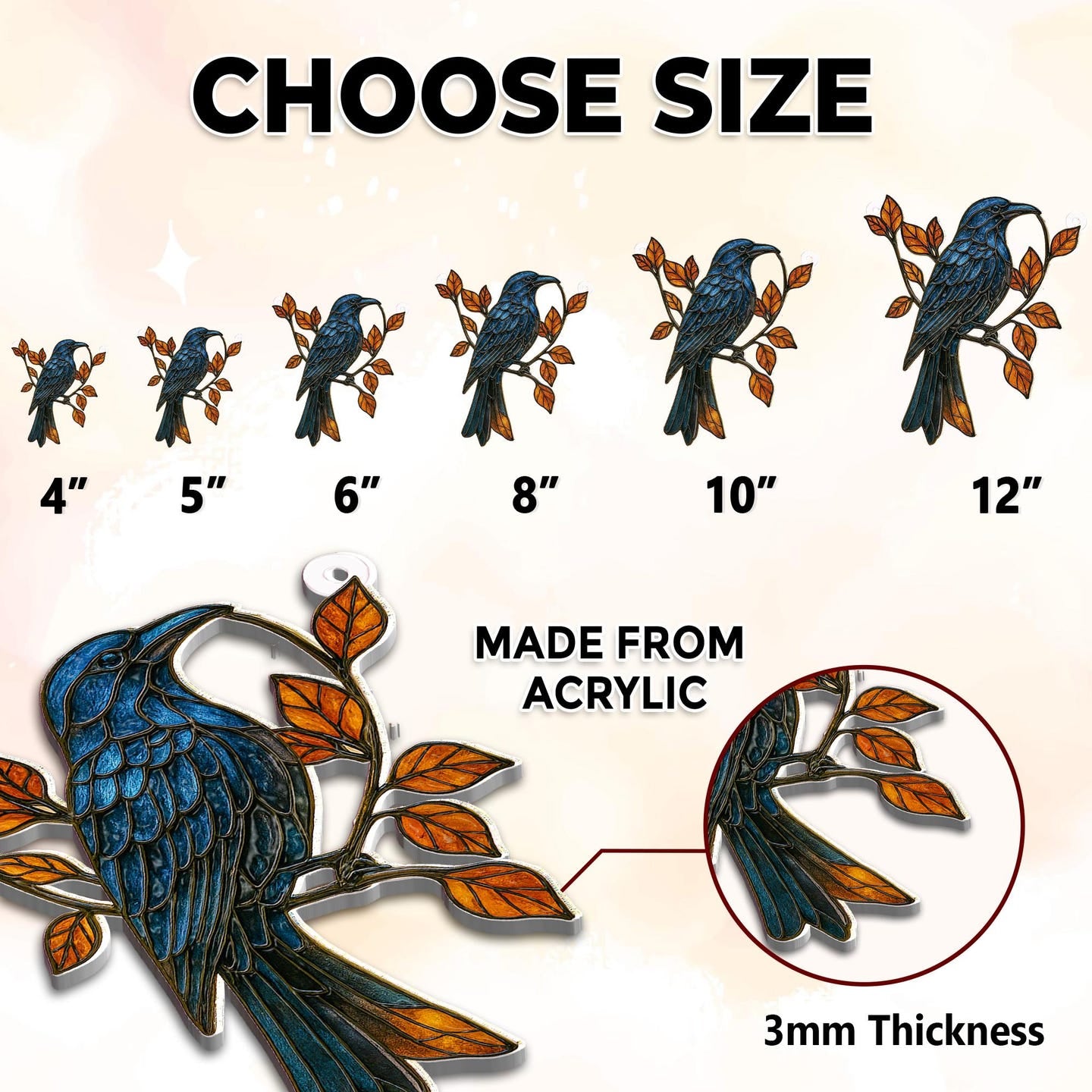 - This piece features a beautifully detailed black raven perched on a curved branch with autumn-hued leaves. The translucent acrylic mimics the glow of stained glass, casting warm shadows when sunlight passes through. The design captures both beauty and darkness — a timeless symbol of wisdom, mystery, and transformation.