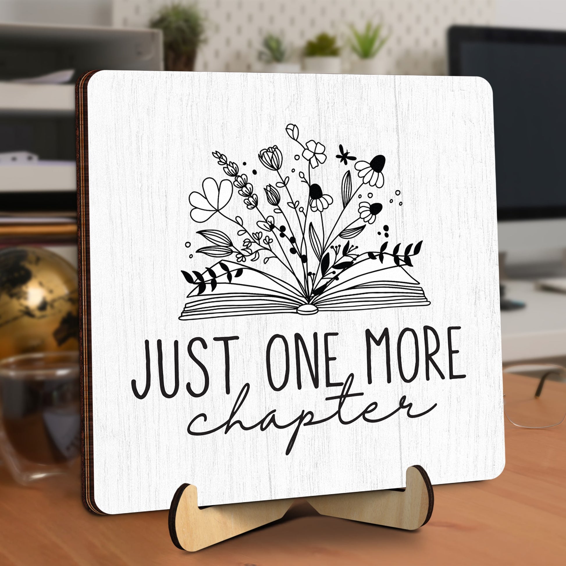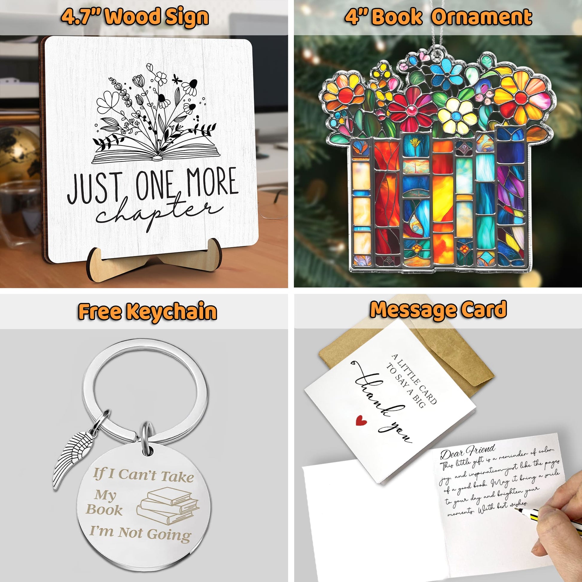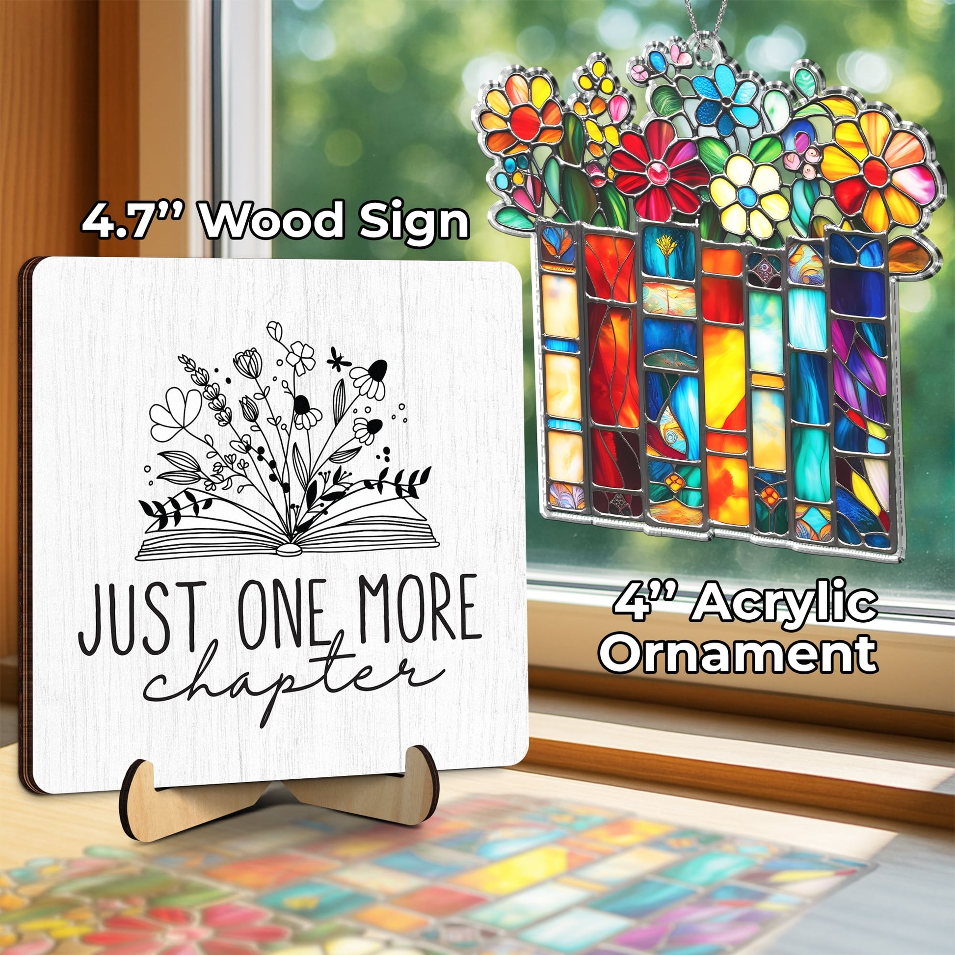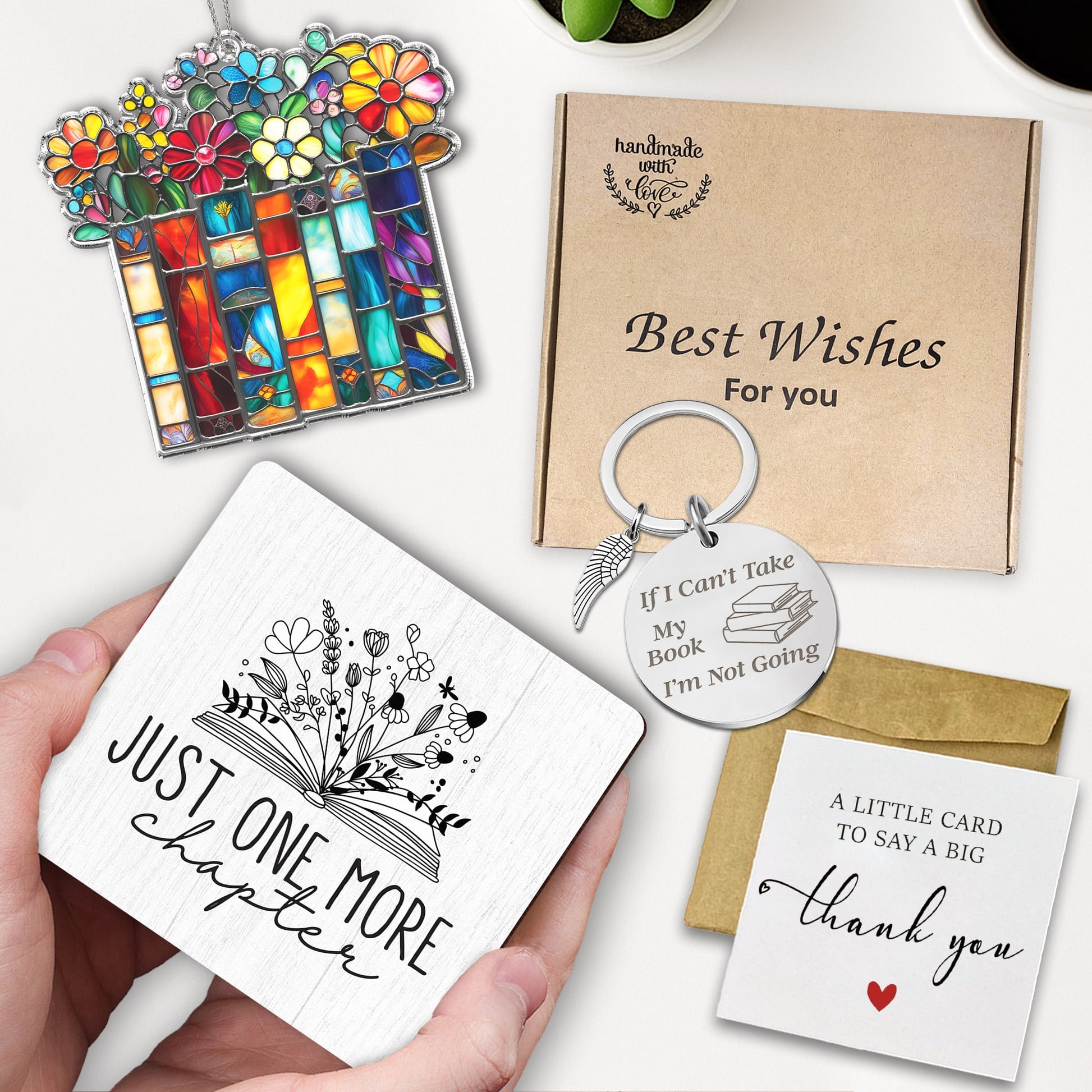 Book Lover Gift Set – ‘Just One More Chapter’ Plaque, Stained Glass Bookmark & Reading Keychain