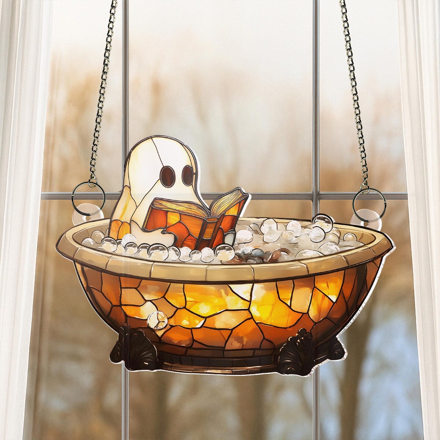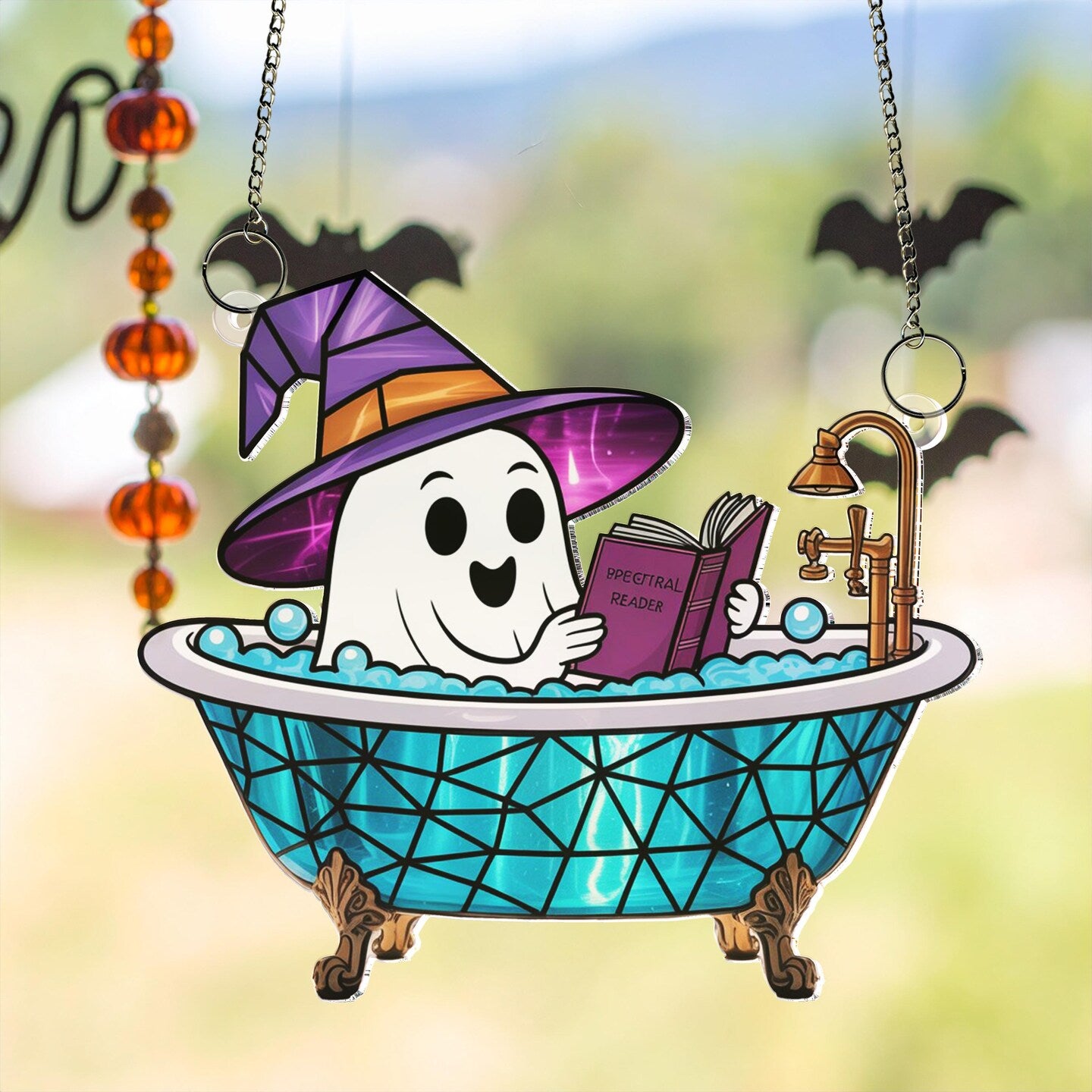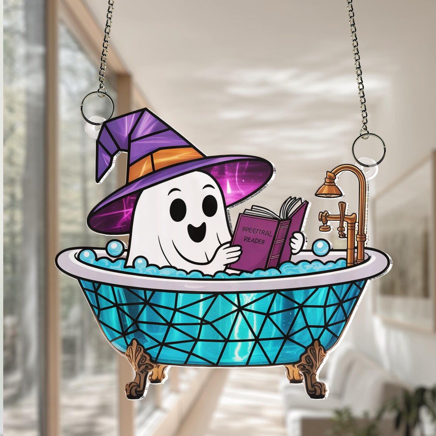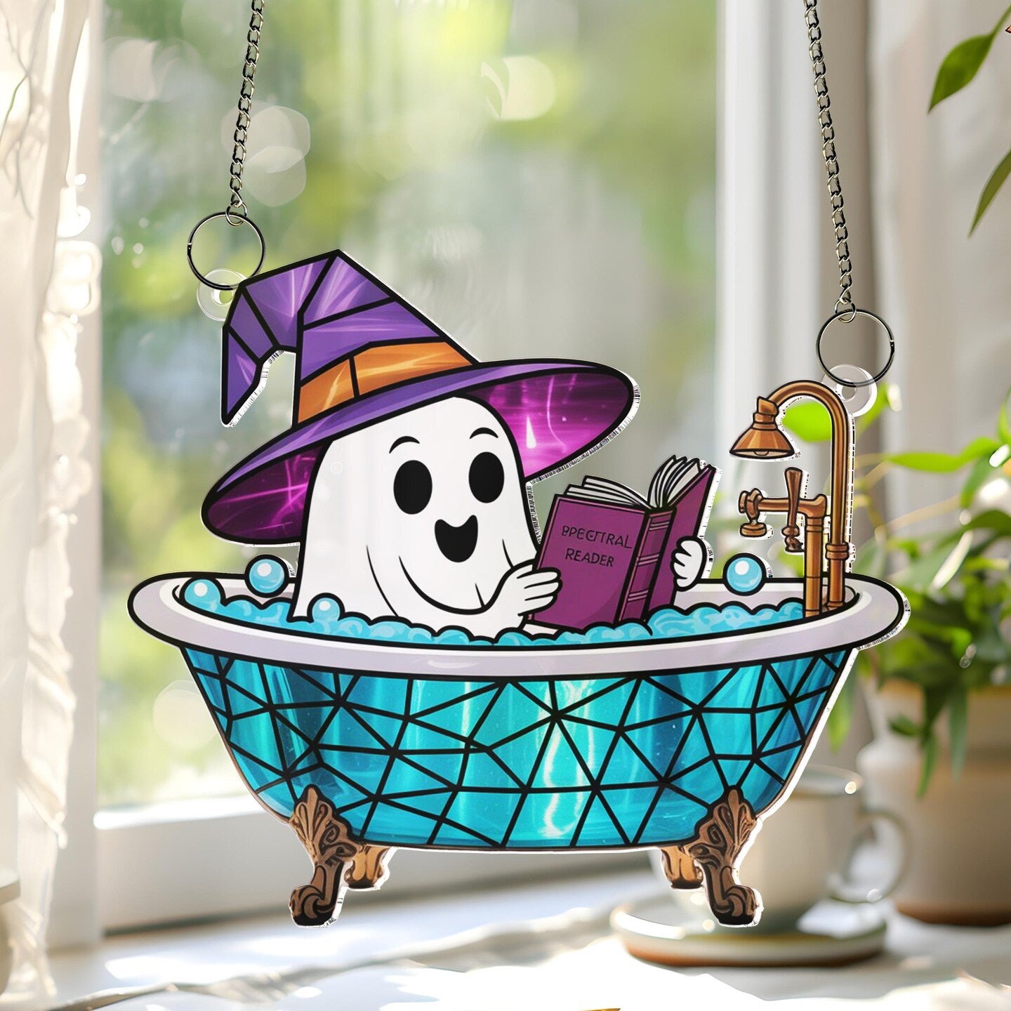 Cute Ghost Reading Book in Bathtub Suncatcher,Window Hanging,Ghost Bathroom,Halloween Decor,Boo Book Lover Gift,Spooky Season Home Decor