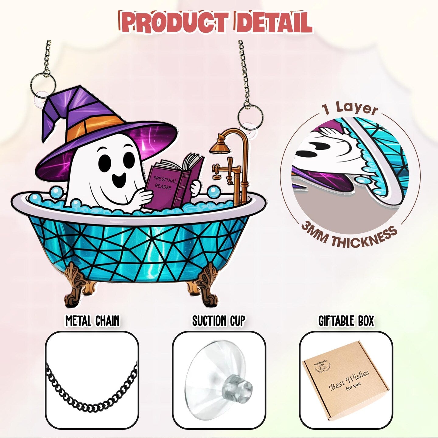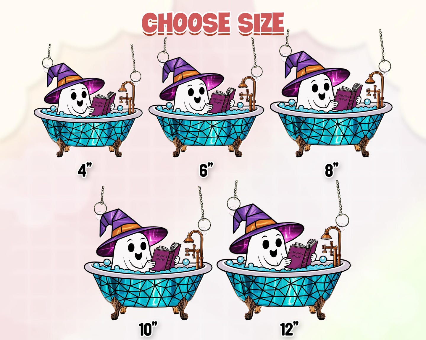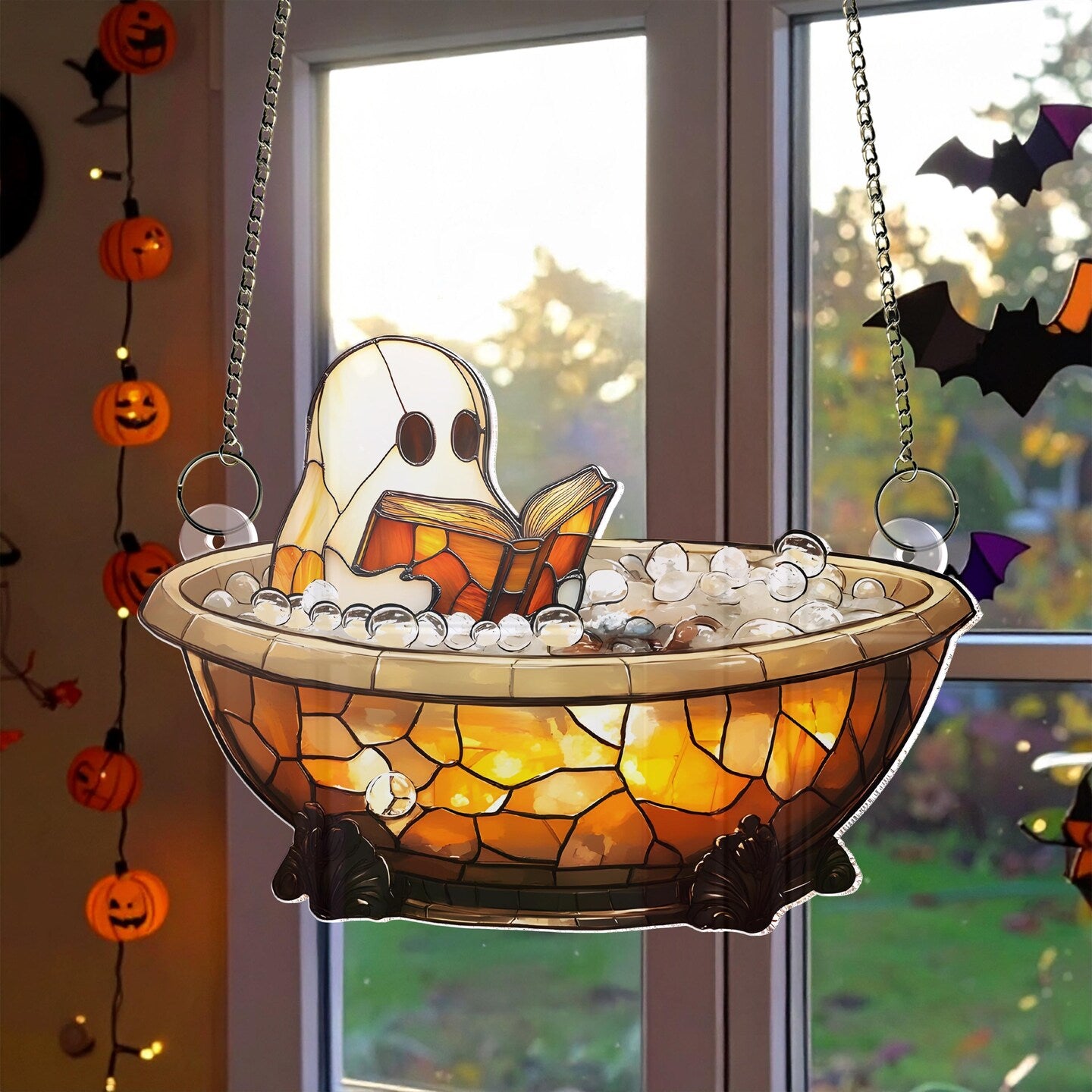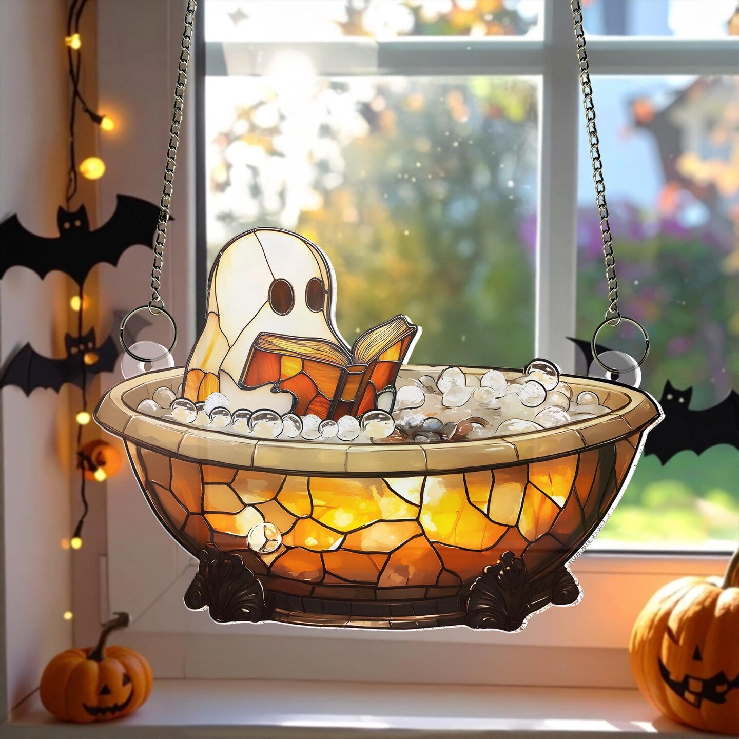 Cute Ghost Reading Book in Bathtub Suncatcher,Window Hanging,Ghost Bathroom,Halloween Decor,Boo Book Lover Gift,Spooky Season Home Decor