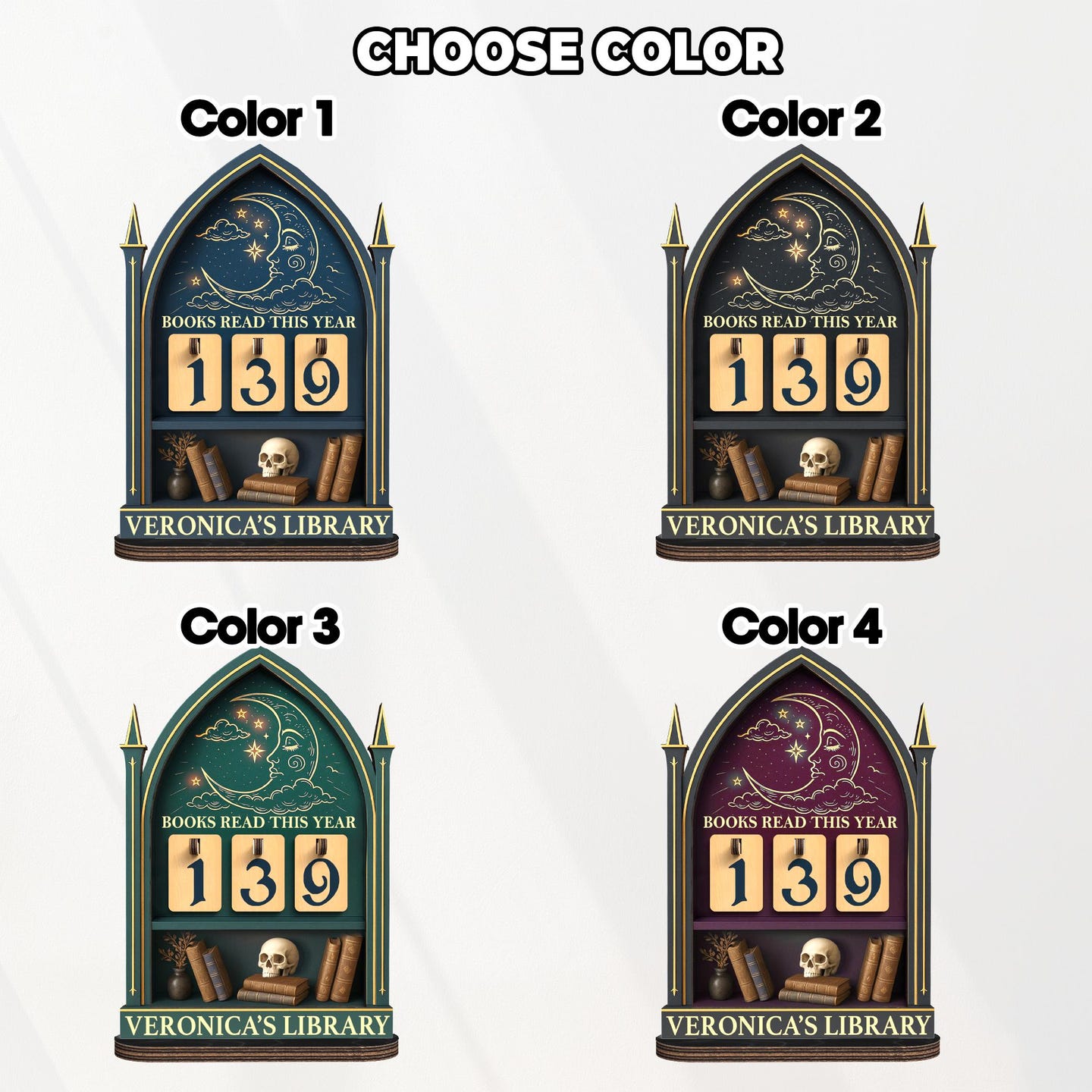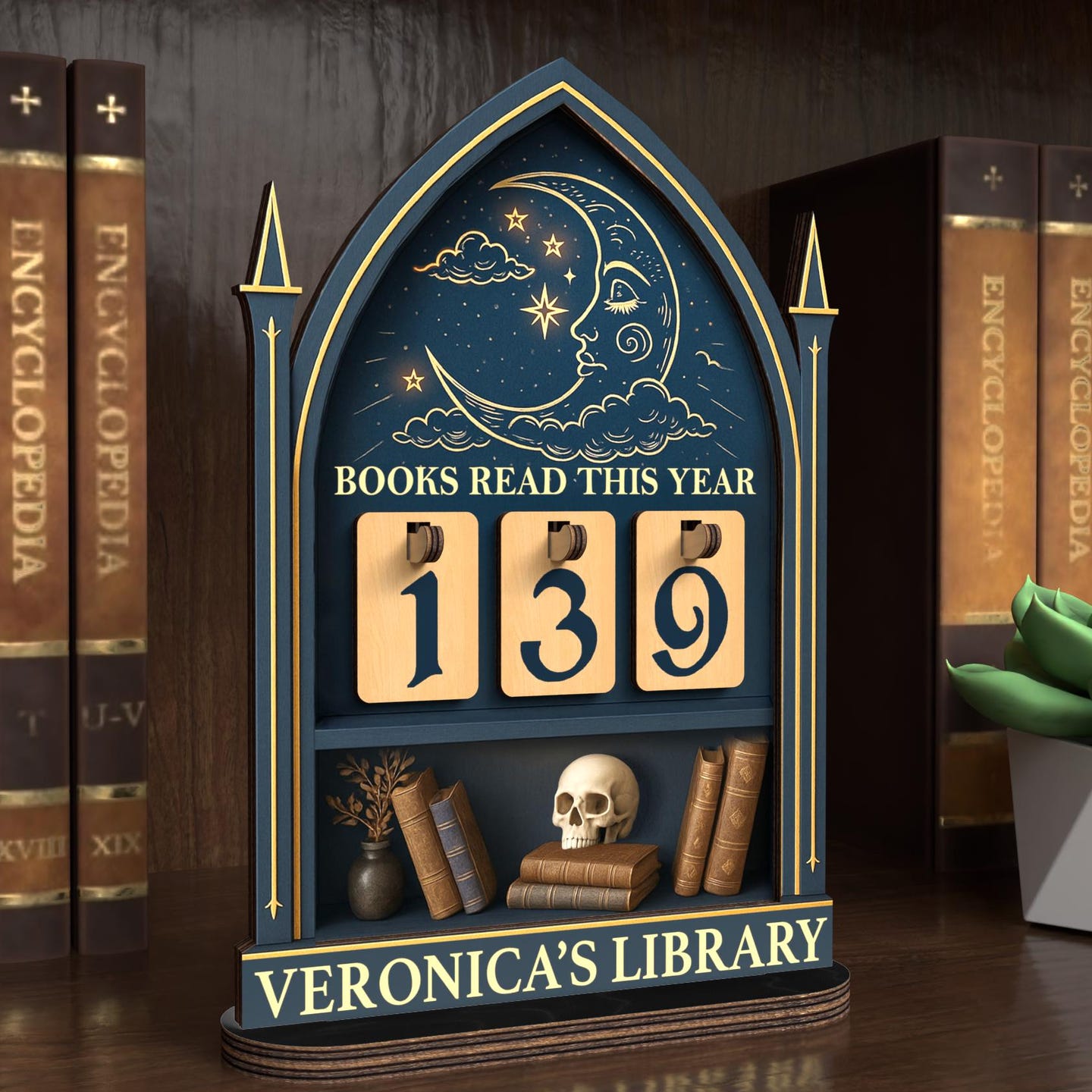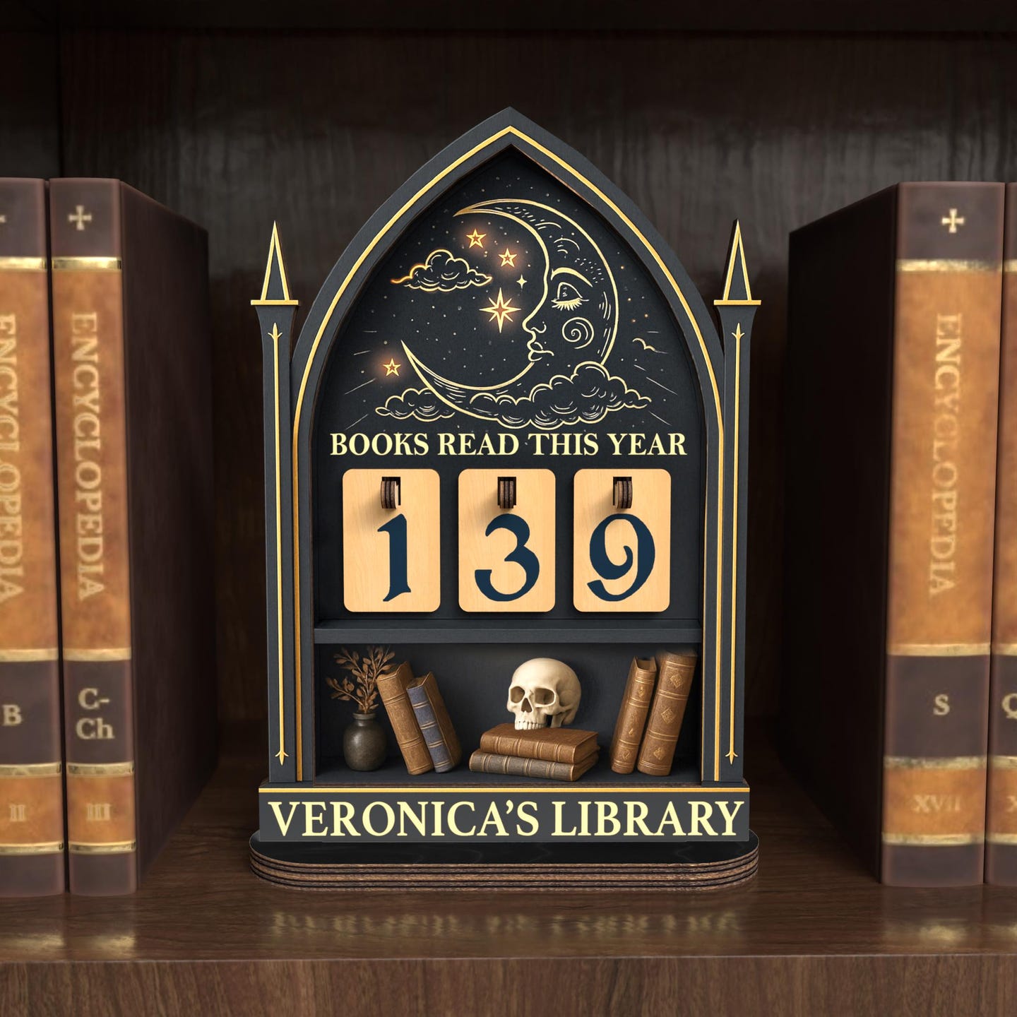 This personalized book tracker is the perfect addition to any book lover's collection. Use it to track the number of books you've read this year, as a centerpiece for your bookshelf, or as a unique decor piece for your desk. It's an inspiring way to motivate yourself to read more and a beautiful way to display your love for reading and all things gothic.