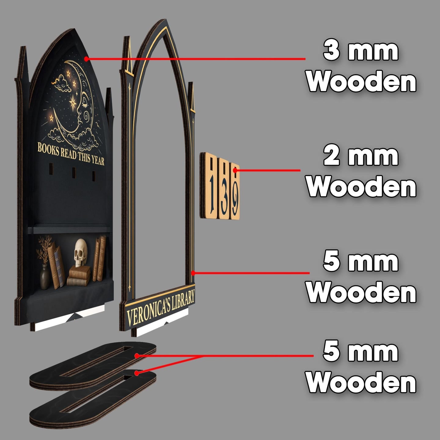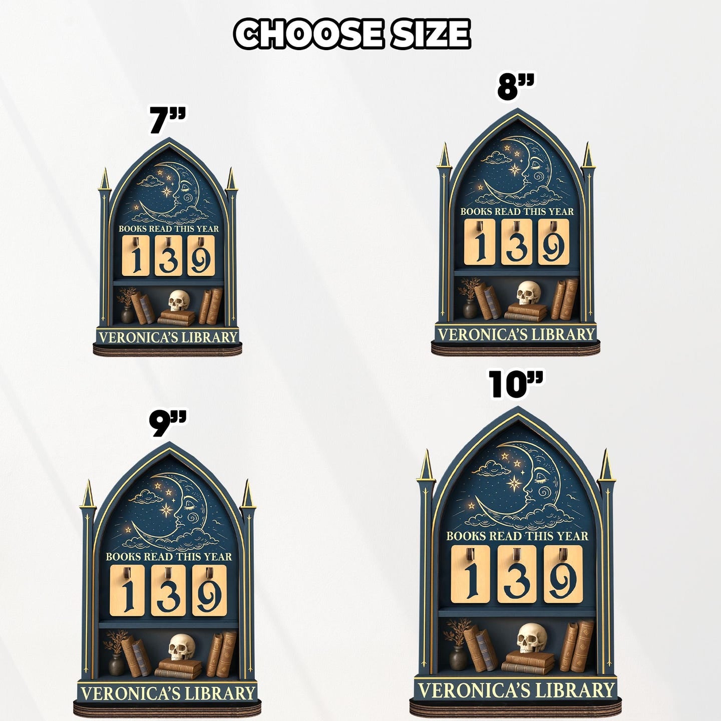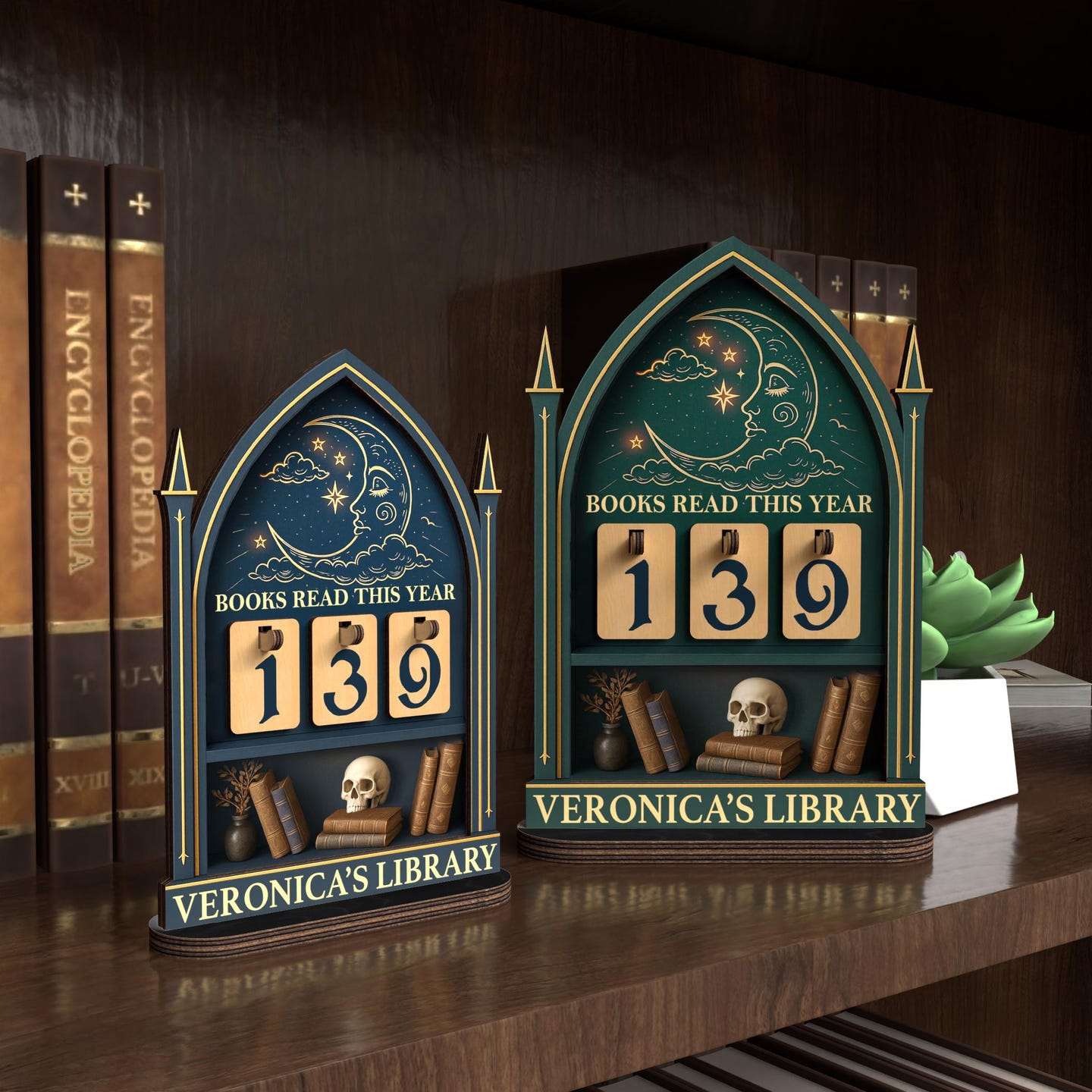 This personalized book tracker is the perfect addition to any book lover's collection. Use it to track the number of books you've read this year, as a centerpiece for your bookshelf, or as a unique decor piece for your desk. It's an inspiring way to motivate yourself to read more and a beautiful way to display your love for reading and all things gothic.